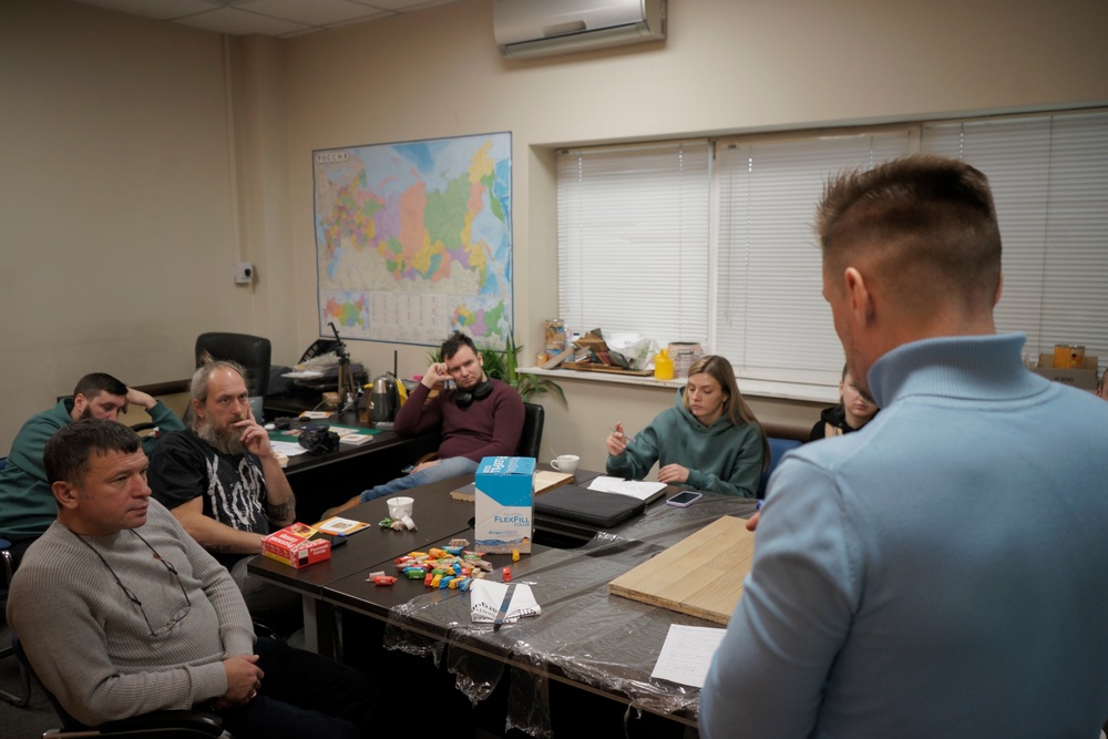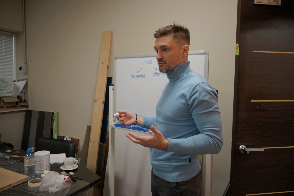 Вот один из таких примеров – на днях Леонид Хлебников провел очередное плановое обучение для сотрудников отдела развития и отдела продаж команды «Вернисаж» в Санкт-Петербурге. Темой пятичасового обучения стали грунтовочные и защитные лаки. Леонид подробно объяснил, чем они отличаются друг от друга, какие задачи выполняют, какой результат дают. В том числе в процессе обучения была продемонстрирована практика нанесения, чтобы каждый из сотрудников своими глазами увидел, как наносятся лаки, какими инструментами и способами, и чтобы они сами попробовали нанести эти материалы.