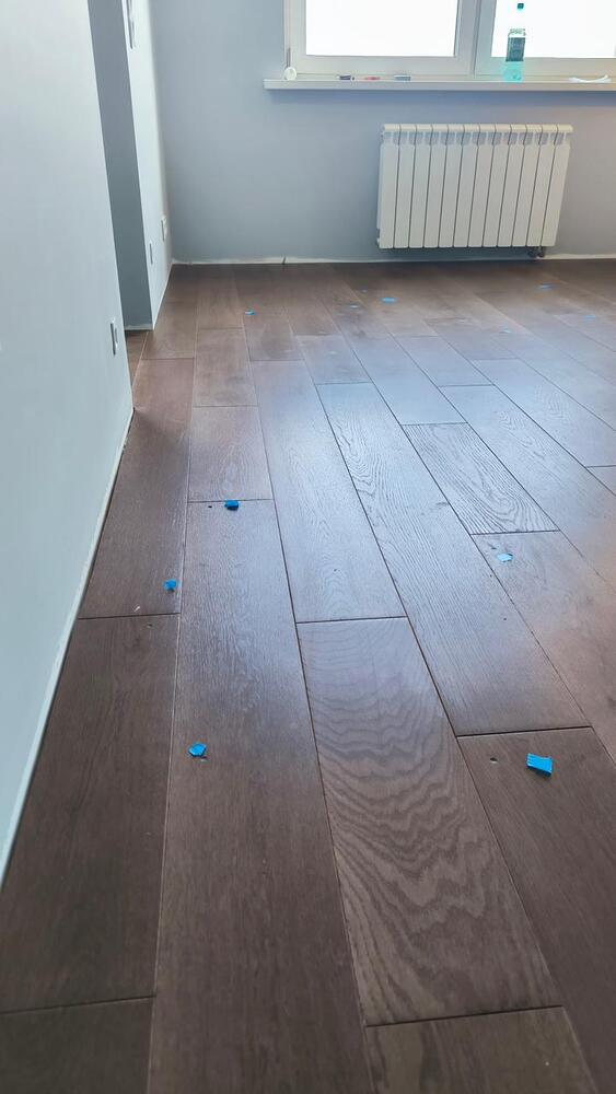 - Кроме перечисленного, на паркете после тех исполнителей остались различные царапины, сколы и даже повреждения покрытия из-за скотча (при отрыве скотча от паркета произошло отслоение покрытия). Все это тоже пришлось устранять.