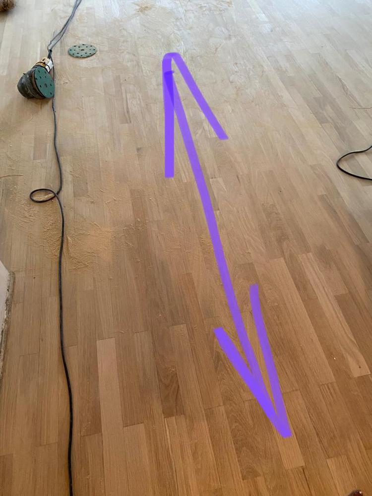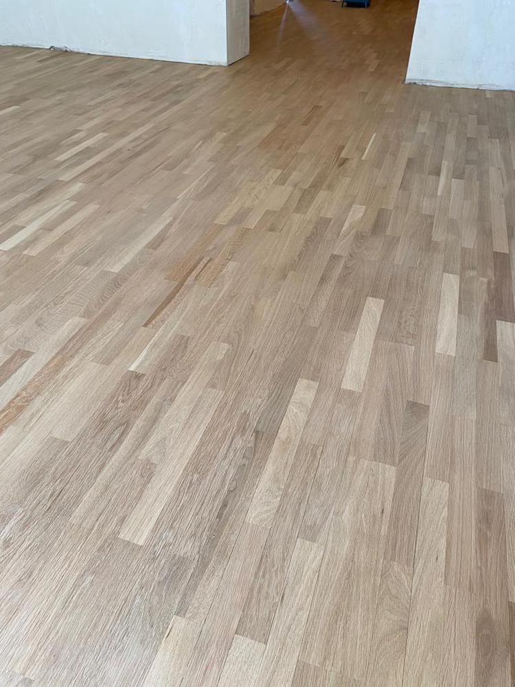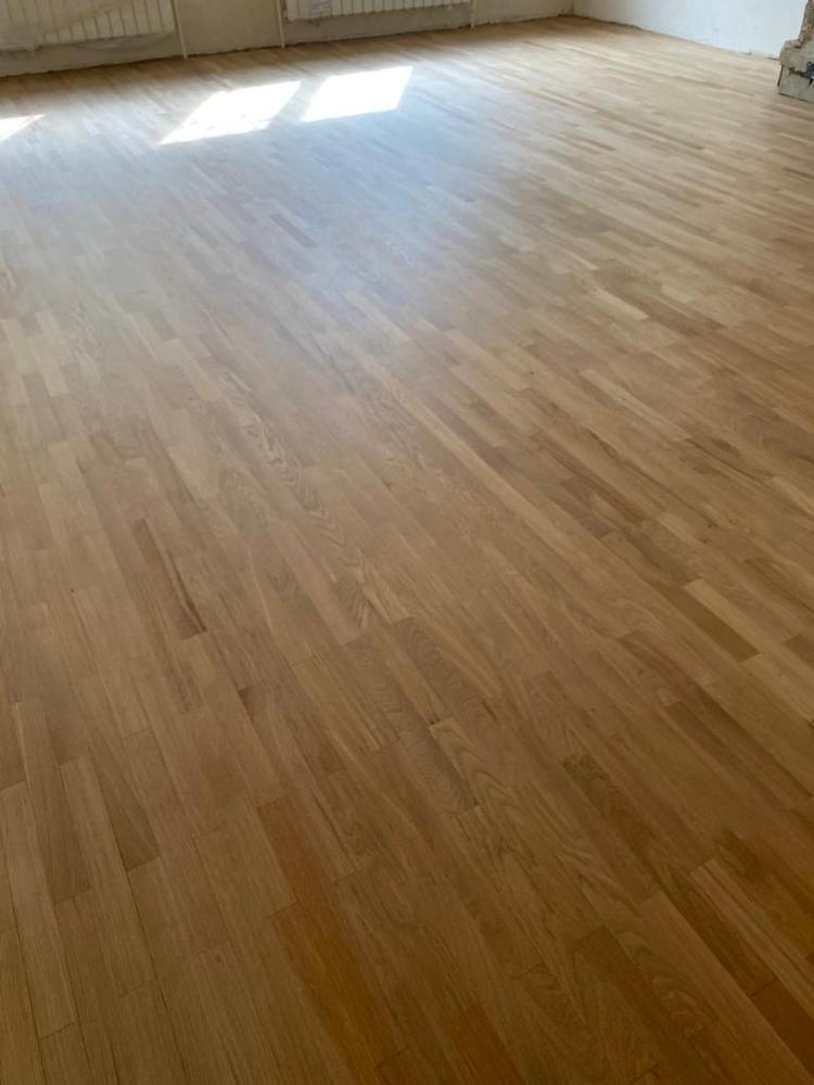 В дальнейшем для исправления ситуации паркет с разводами снова перешлифовали, и клиент решил дальше покрывать паркет самостоятельно уже по моей рекомендации, то есть нанося каждый слой лака вдоль волокон.
