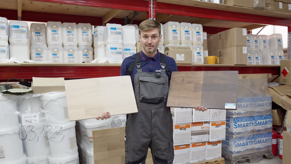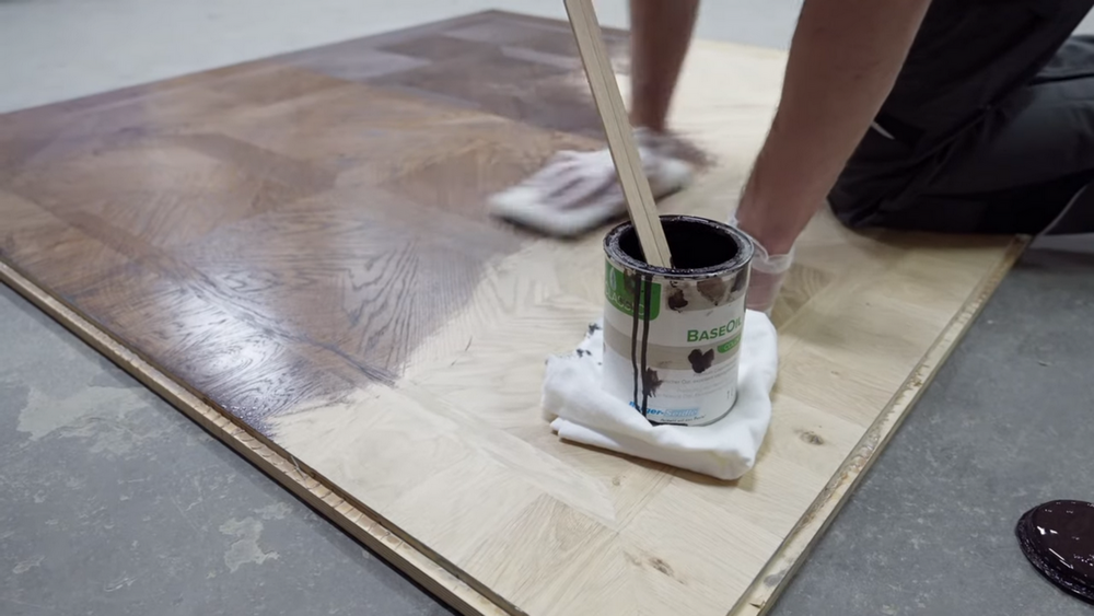 Перед началом работы с цветным маслом очень важно, во-первых, баночку взболтать, но этого недостаточно. Любой цветной материал – это основа и пигмент. Пигмент всегда тяжелее основного материала, и поэтому он оседает на дно или стенки. Поэтому нужно не только взболтать банку, но и после ее открытия необходимо будет дополнительно тщательно перемешать масло, чтобы распределить пигмент равномерно по всему объему тары. На фото вы видите пример, как половина паркетного щита покрашена с поднятым ворсом, а вторая обычным способом – просто масло.