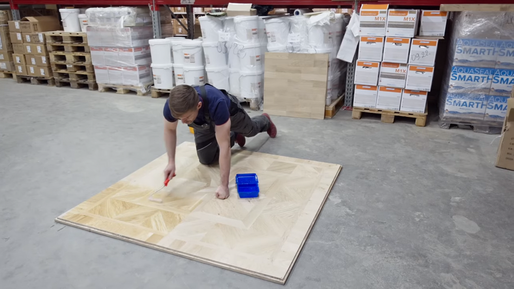 После шлифовки паркета вы делаете хорошую уборку пылесосом, чтобы собрать всю пыль с поверхности. Далее вам необходимо подготовить ванночку и ручку с валиком. Для небольших выставочных щитов мы используем маленькие валики, а при укладке паркета непосредственно на объекте, где вы работаете с большой площадью, конечно, удобнее делать это большим валиком с ручкой на палке. Также нам понадобится обычная питьевая вода – главное, чтобы она была чистая.
