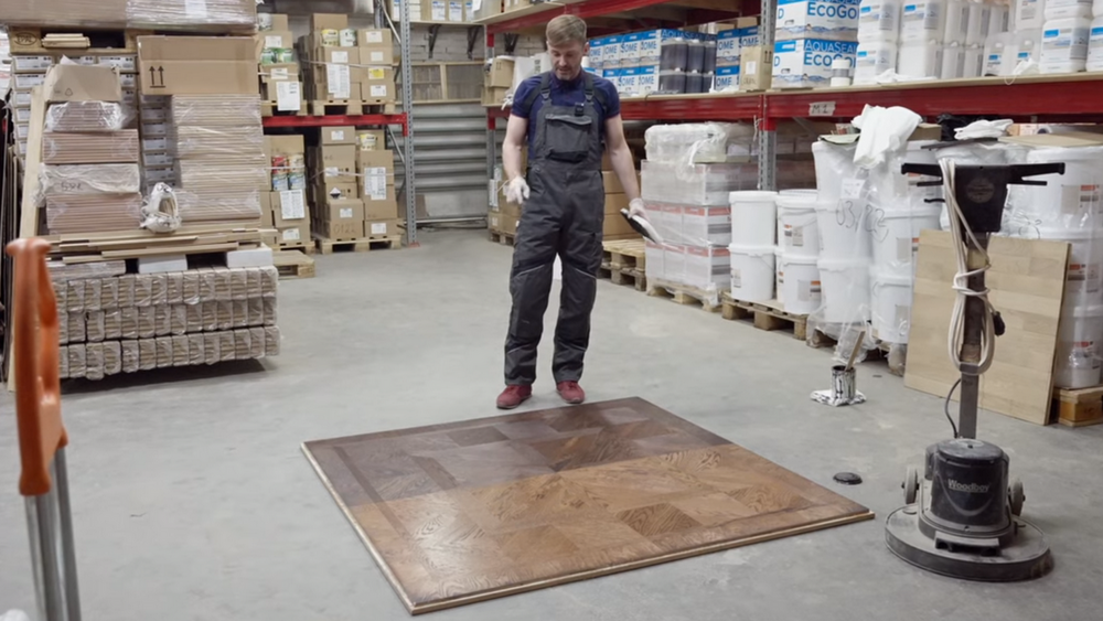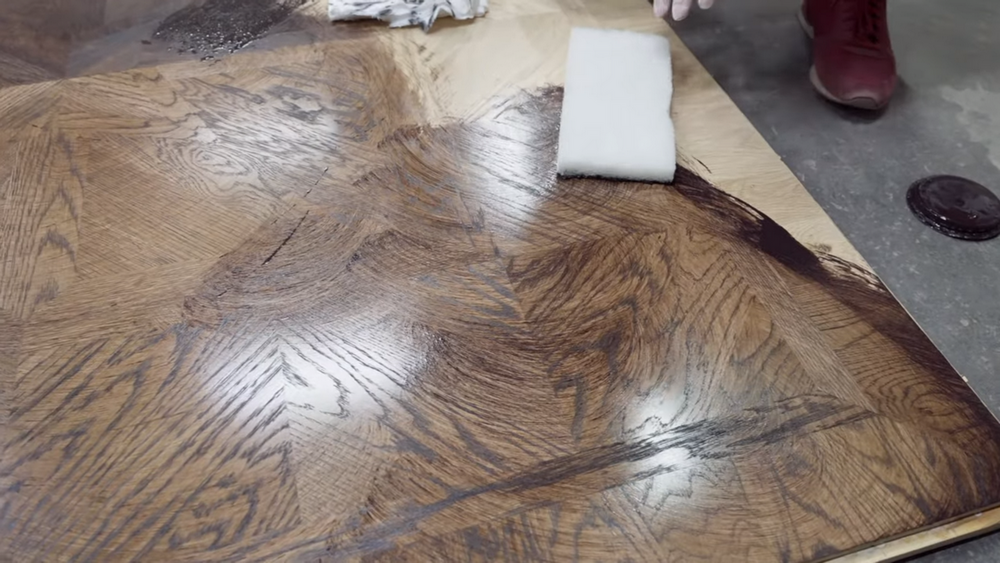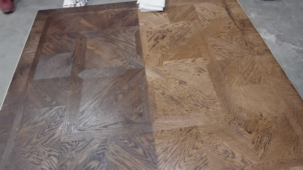 А теперь открою вам небольшой секрет. Во-первых, вы видите, какая разница в насыщенности цвета получается, когда у нас поверхность просто отшлифована или после шлифовки был поднят ворс водой. Есть еще одна хитрость – эту хитрость очень часто поменяют опытные паркетчики, так сказать, для страховки. Когда у вас поднимается ворс водой, этот эффект скрывает мелкие дефекты от шлифовки паркета. То есть у вас ворс весь поднимается, и это все сливается с микроцарапинами на поверхности паркета. Условно говоря, это такая небольшая страховка от каких-либо незначительных дефектов. Конечно, это не значит, что теперь можно плохо шлифовать и эффектом water popping все скрыть. Нет, не совсем так. Но с поднятым ворсом вы будете гораздо спокойнее, что у вас со шлифовкой и царапинами будет гораздо меньше проблем.