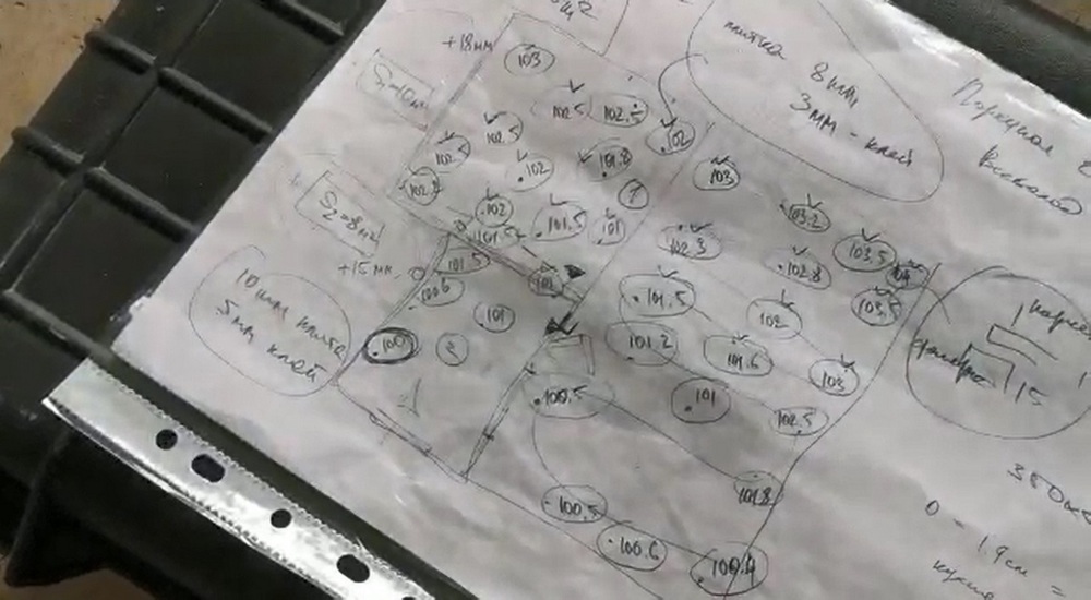 На объект мы выходим с предварительно подготовленной картой замеров. По ней мы рассчитали количество необходимого материала, там же указаны контакты заказчика и все оговоренные с ним детали.