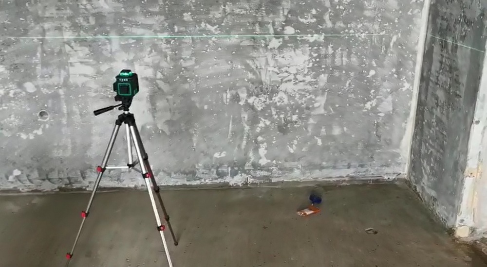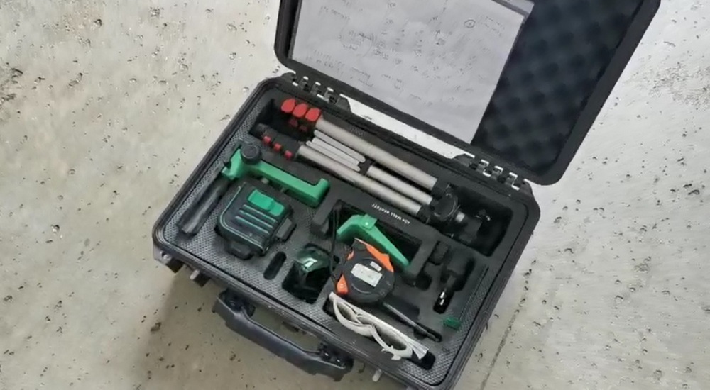 Для разметки отметок мы используем такой набор: лазер во всех направлениях, штатив, карандаш и карта замеров предыдущего визита. При первом визите на объект мастера составляли карту и нанесли отметки высот на стенах. Благодаря этому при выходе на работы можно легко восстановить картину: мы берем лазер и сверяемся с прошлыми метками. Будем уже устанавливать натяжители, натягивать струны и выставлять их по уровню пола.