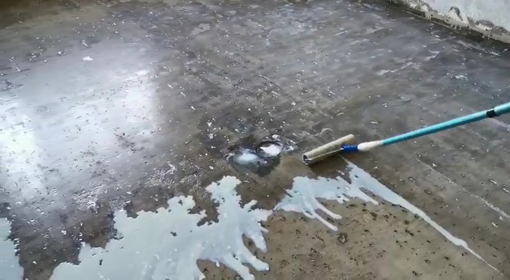 После очистки основания выполняем грунтовку пола в два слоя: первый слой высыхает, затем наносим второй. Наносим обильно, протягивая лужу так, чтобы расход был достаточно большой и все неровности равномерно заполнились грунтовкой.