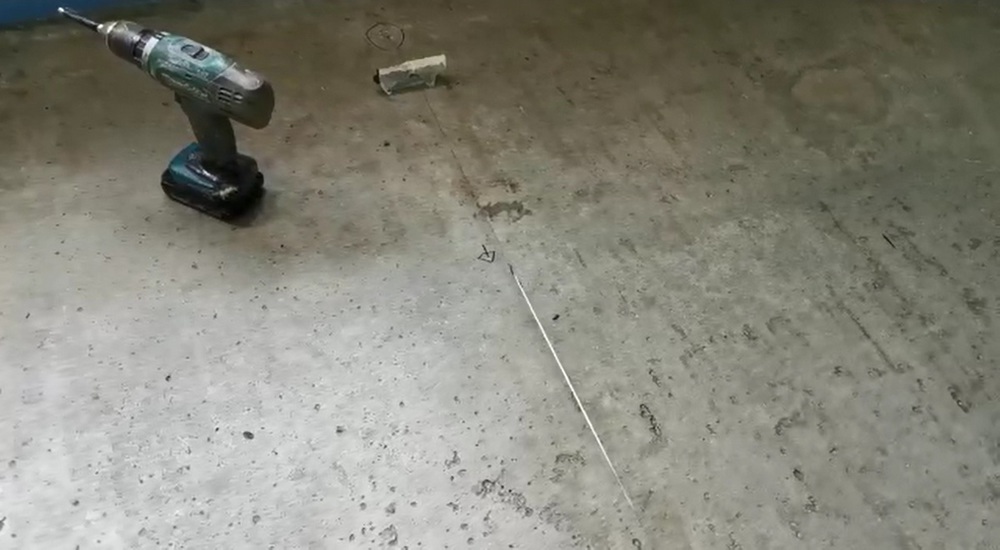 Далее нам необходимо определить отступы от стен для размещения маяков. Мы выставляем отметки на полу, обозначаем их треугольниками, шнуром отбиваем направление. Для крепления направляющих мы будем использовать дюбель-гвозди, поэтому для них нужно заготовить отверстия в полу.