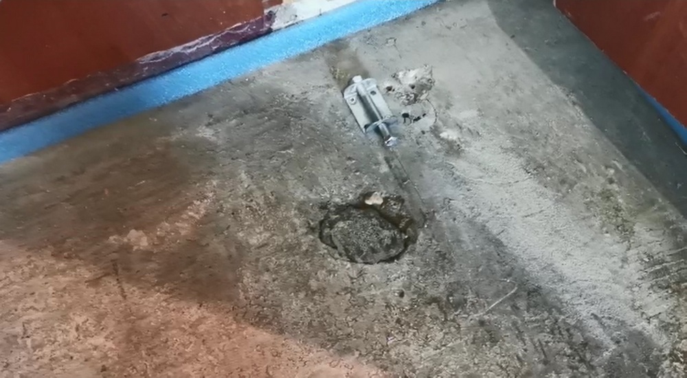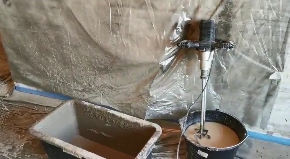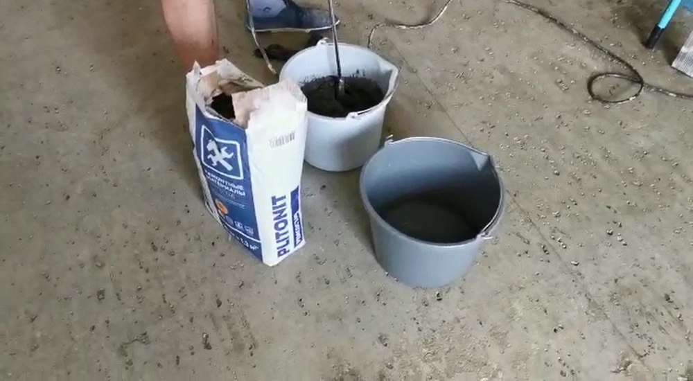 Фиксацию маяков мы выполняем ремонтным материалом Plitonit. У него цементная основа, и он достаточно быстро твердеет – то, что нам нужно в этой работе. Этим же составом мы ремонтируем места, где есть повреждения (например, вокруг труб отопления и других коммуникаций). Во время смешивания смеси невольно попадает что-то на стены, поэтому мы закрываем части стен укрывным материалом. Также для этих целей в местах проноса и прохода расстелен полиэтилен, который мы потом снимаем, и если что-то высыпалось, все это шпателем чистим и в целом оставляем чистоту.