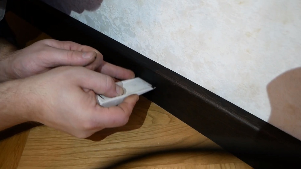 - Можно взять самый простой: подрезать плинтус, подмазать в цвет тонировки его отрезанный торец.