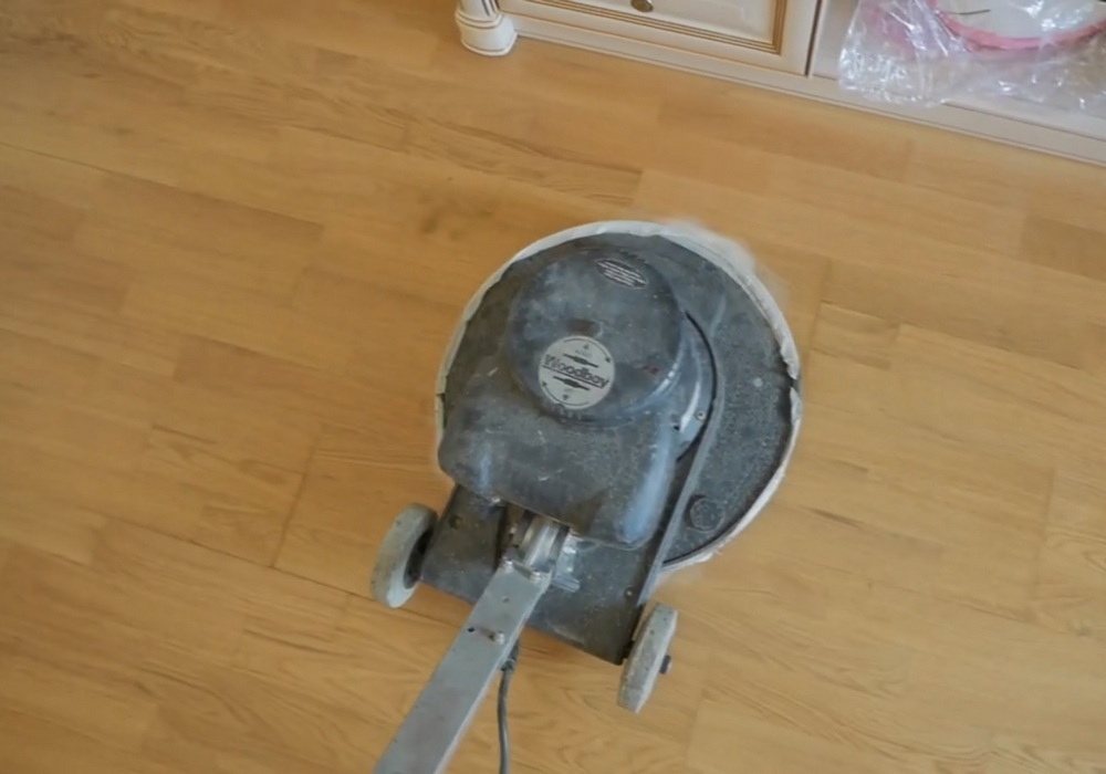 - Обезжиривание поверхности паркета. Мы рекомендуем перед нанесением дополнительного защитного слоя сначала обезжирить поверхность с помощью специального средства. Например, на своих объектах при выполнении паркетных работ мы используем очиститель Cleaner L 91 от производителя Berger Seidle. Это делается просто: вы смачиваете специальным средством обычную тряпку или ветошь и обрабатываете поверхность, то есть просто смываете весь воск. Если речь идет о помещении большой площади, можно использовать однодисковую машину с белым падом. L 91 очень быстро улетучивается, очень быстро испаряется с поверхности.