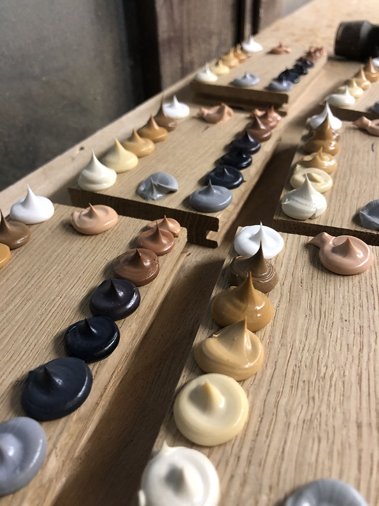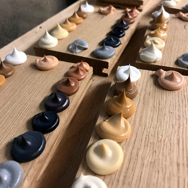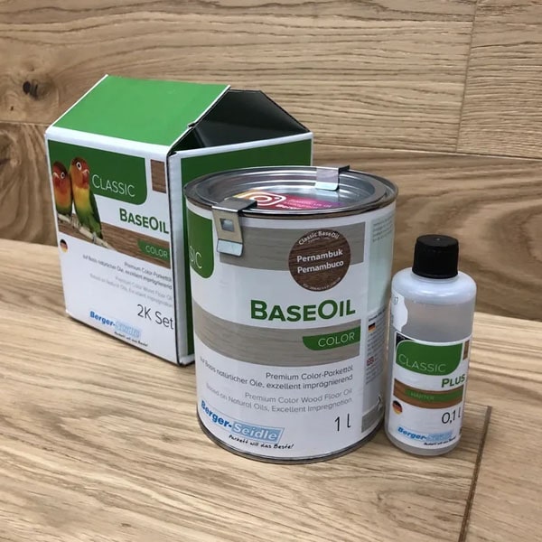 - Для изменения цвета доски рекомендуем использовать цветные масла, например, цветное масло Berger BaseOil или цветную грунтовку Saicos Ol-Grundierung. Оба состава имеют достаточно широкие палитры цветов, из которых можно выбрать понравившийся. Но до начала работ рекомендуем обратиться к профессионалам, в том числе, можно обратиться в нашу компанию «Вернисаж», чтобы сделать пробные выкрасы. Образцы цвета масел на сайтах дают очень примерное представление об итоговом результате, а в офисах живые образцы обычно сделаны на дубе. Так как у клиента сосновые доски, то оттенки точно будут отличаться от этих образцов, поэтому нужно сделать выкрасы на оригинальной древесине – наши специалисты с удовольствием в этом помогут.