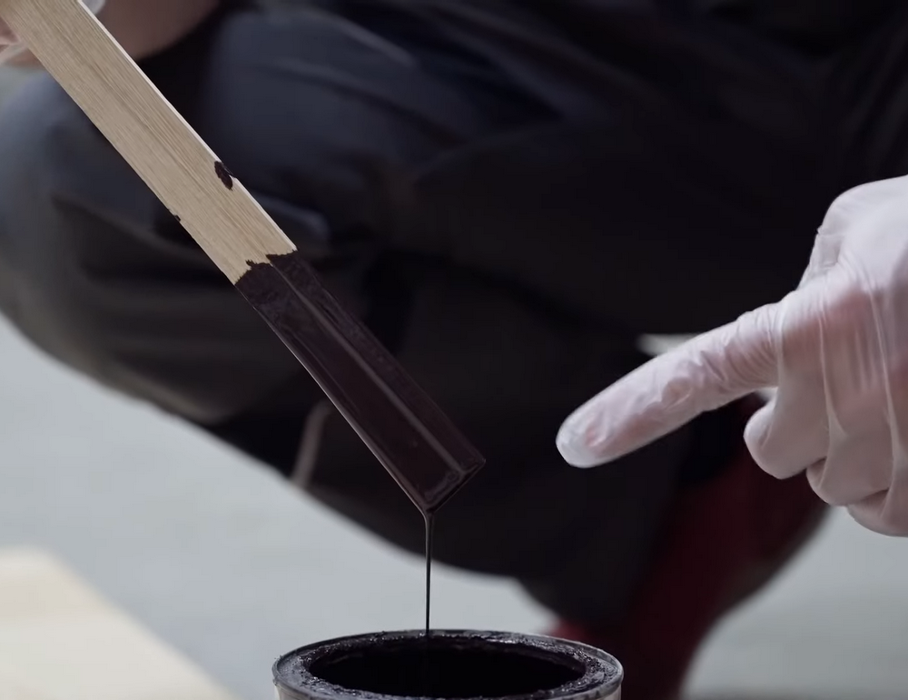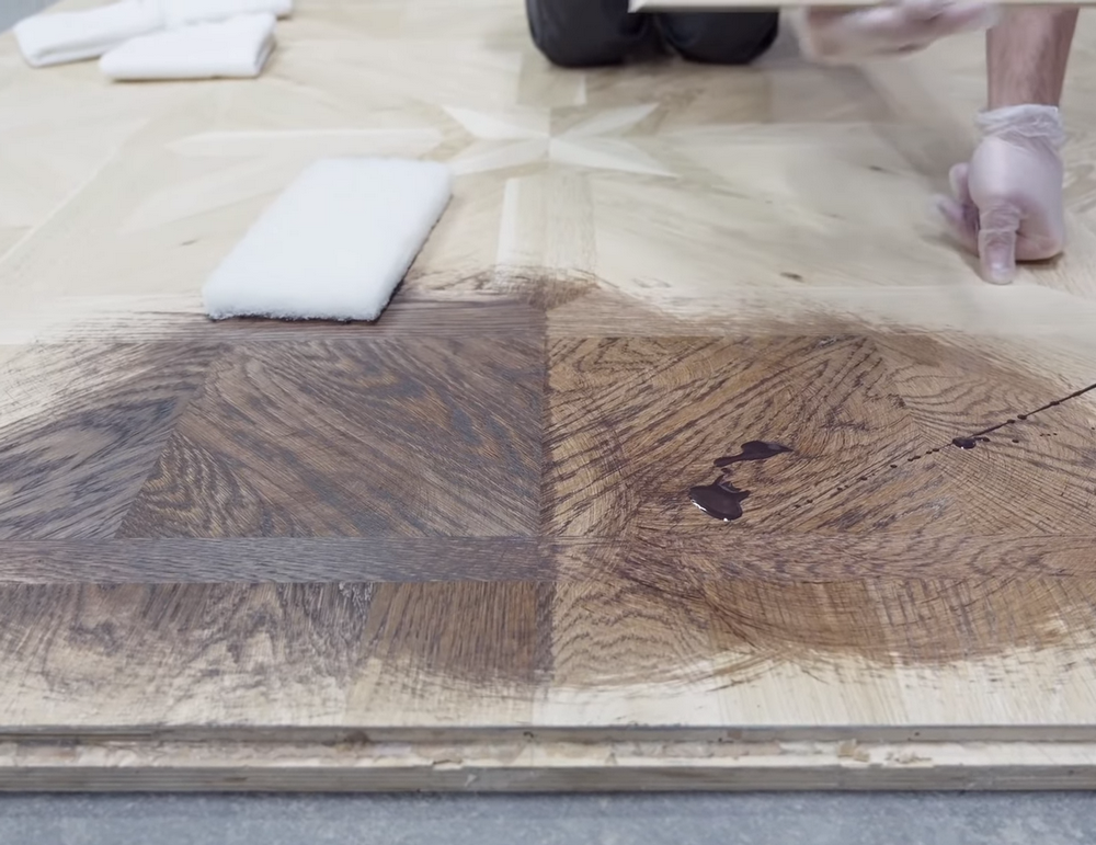 Даже в момент нанесения уже видно, что части паркета, которые не были и были смочены водой, сильно отличаются друг от друга. В первом случае цвет получится светлее, а во втором гораздо более насыщенный. Даже в момент работы это сильно ощущается, поскольку это более шероховатая поверхность, она в нанесении более сложная скажем.