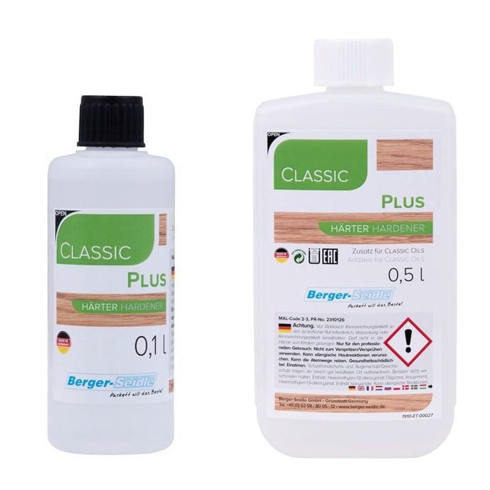 - Если в качестве финишного покрытия будут использованы лаки, то перед нанесением натурального масла в него необходимо добавить ускоритель высыхания, он же отвердитель Berger Classic Plus. И вот эта двухкомпонентная схема – и есть двухкомпонентное масло, которое называется Berger BaseOil 2К. Когда оно полностью застынет, можно будет покрывать паркет двухкомпонентными водными лаками, но тоже от компании Berger.
