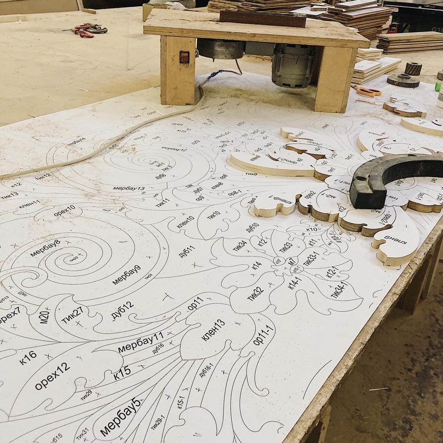 Чтобы восстановить сложные узоры паркета первоначально мастера определяют породы древесины, используемые в художественном или дворцовом паркете, делают шаблоны, лекала, отправляют их на производство, где создаются новые элементы, которые впоследствии вклеиваются вместо старых.
