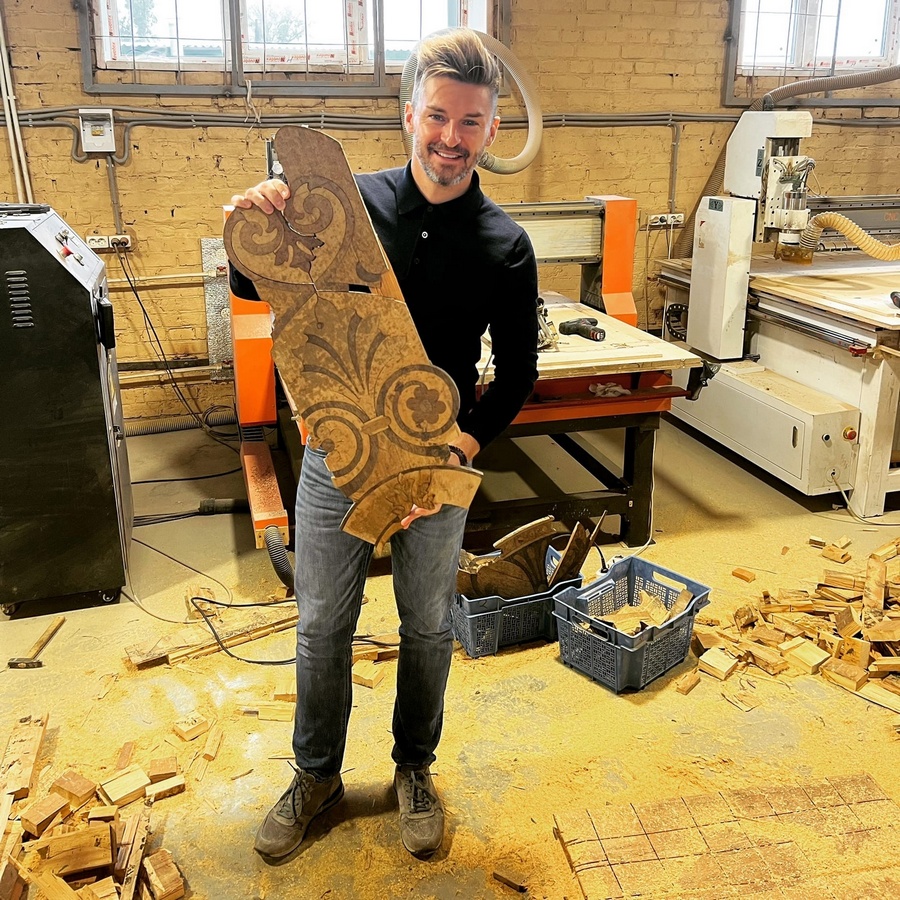 Для восстановления узоров художественного паркета есть разные способы. Можно сделать лекала и напилить новые элементы по лекалам в условиях цеха/производства. В каких-то ситуациях можно это сделать прямо на объекте, используя ленточные или лобзиковые пилы.