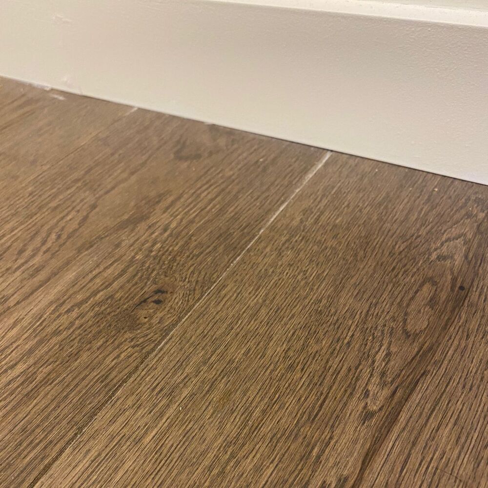 Поперечная царапина – наиболее сложный случай для реставрации, если иметь в виду царапины. На данном объекте паркет был тонирован маслом с твердым воском, а царапина возникла в результате неаккуратной перестановки мебели. Мастера потратили около 6 часов на устранение повреждения. Для работы традиционно применяли ремонтно-реставрационные материалы Novoryt – шпатлевку-расплав, ретуширующие краски и безореольный фиксирующий лак.
