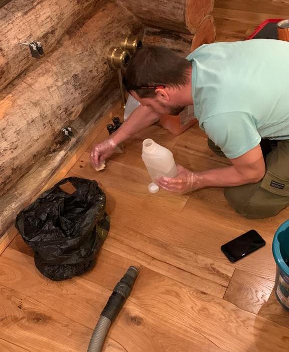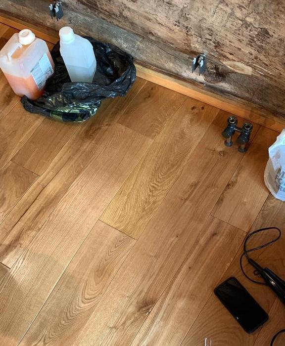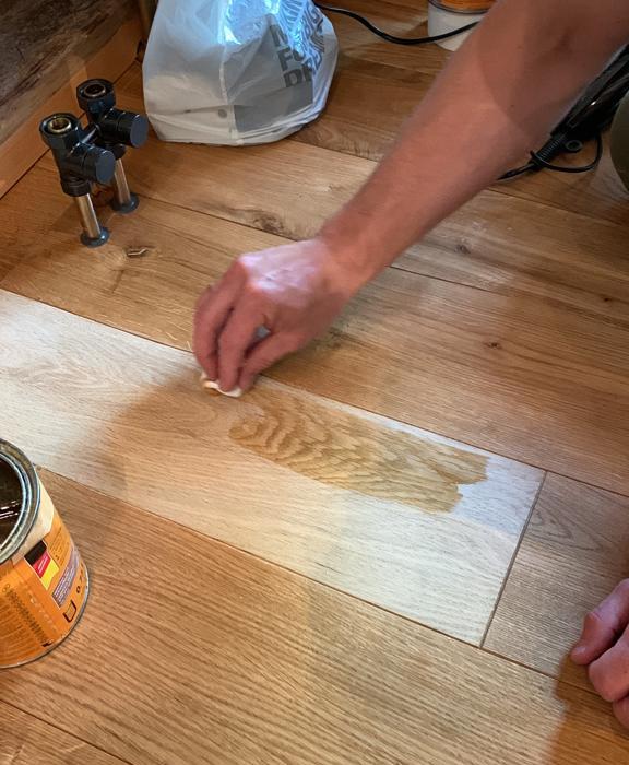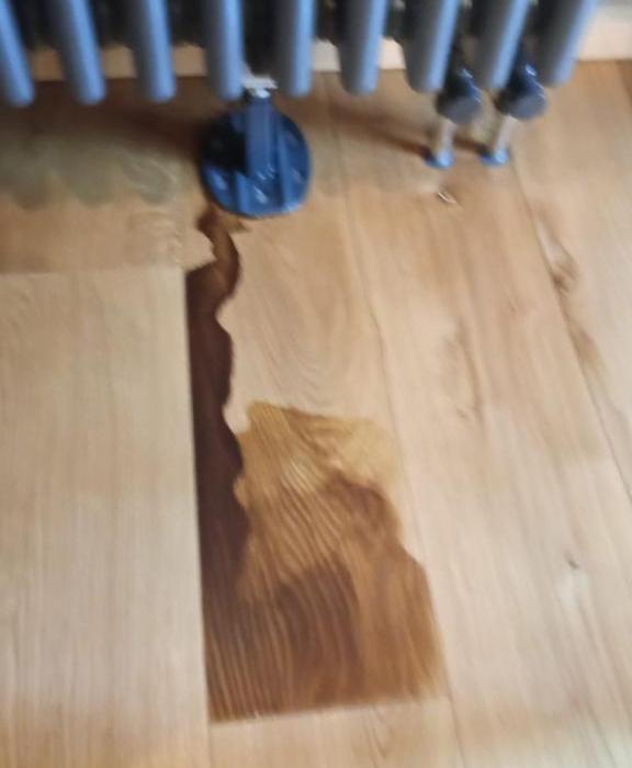 Еще одна неприятная ситуация, которую удалось устранить. В частном доме на паркет, покрытый маслом с твердым воском, протек антифриз. Пятно удалось очистить средством Saicos Power Gel и перекисью водорода 24%. Работы по реставрации паркета заняли 2 дня. После воздействия химии паркет пришлось немного тонировать и далее его покрыли маслом с твердым воском Saicos Premium Hartwachsol арт. 3200 (шелковисто-матовое) в 2 слоя.