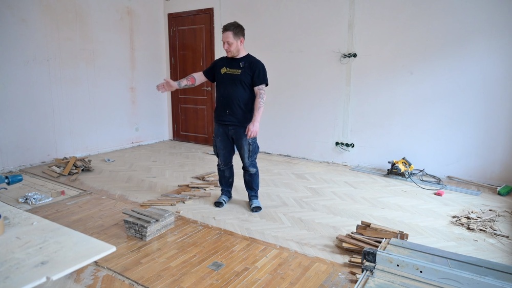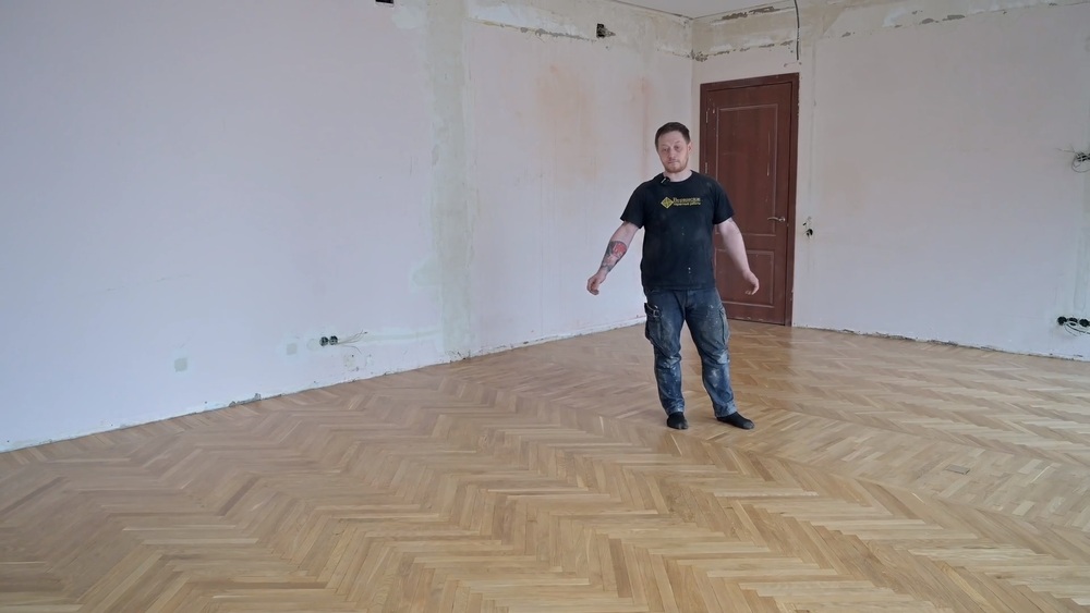 Итак, наш клиент в процессе ремонта квартиры решил восстановить геометрию помещения, убрав ненужную ему перегородку. После демонтажа этой стенки в полу осталась дыра толщиной с убранную стену, и именно этот паркетный пробел нам нужно было как-то заделать, чтобы в итоге полы в помещении смотрелись органично. Здесь еще в 1970-х годах был уложен советский паркет рисунком елочка – весьма традиционный для того времени.