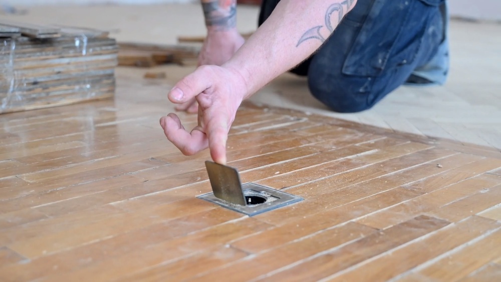 Здесь 2 момента. Прежде всего, для этого нужен паркет определенной толщины, определенной длины и в определенном количестве. И даже если бы мы нашли нужное количество подходящих планок и продолжили укладывать паркет елочкой, то мы все равно стопроцентно не попали бы в рисунок, так как в каждом помещении паркет укладывался отдельно – напомним, что удаленная стена отделяла 2 разные комнаты. Поэтому было принято решение восполнить паркет именно таким способом. С учетом того, что по проекту в данном месте будет стоять диван, такое решение выглядит вполне логичным. А специально для дивана электрики тут еще и подвели розетку.