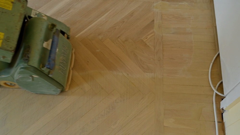 Что мы решили делать? Для заполнения появившейся пустоты использовали паркет, снятый с отбоя с той и другой стороны. Все плашки были пыльные, грязные и довольно неровные. Пришлось его чуть-чуть зачищать и прогонять по гребневой стороне, чтобы счистить грязь, которая там налипла, поскольку паркет был покрыт лаком ПФ-231.
