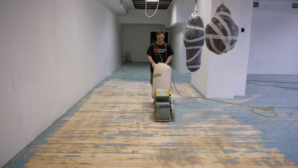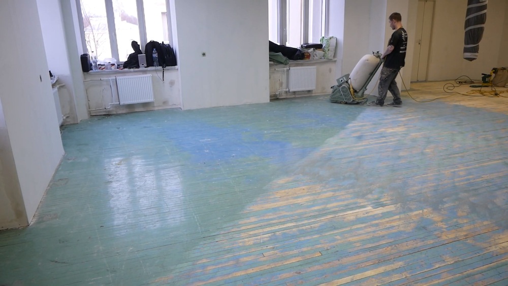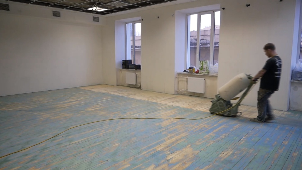 Снятие краски на этом объекте заняло достаточно много времени и было трудоемким, но мастера, конечно же, успешно со всем справились. Далее, чтобы задать плоскость, нужно снова пройти помещение машиной Hummel с использованием абразива № 36 по диагонали.