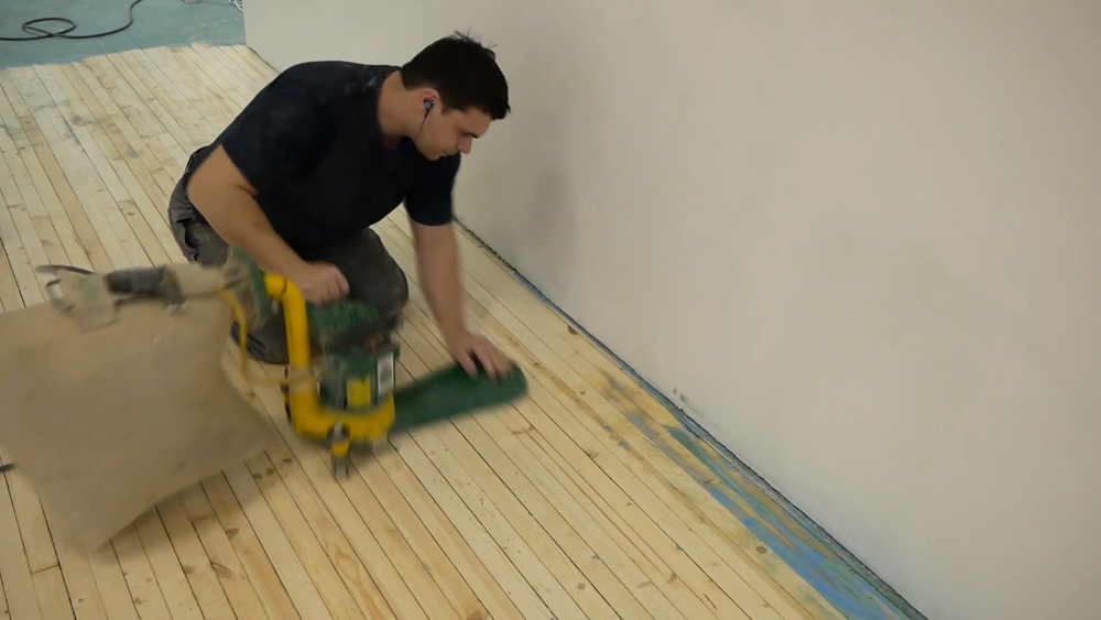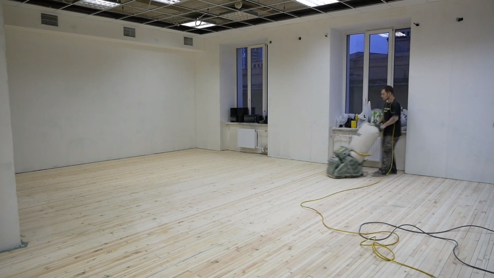 На данном объекте прежде всего необходимо выполнить шлифовку деревянного пола. На полу – многовековые слои краски, которые нужно сначала сциклевать, и впоследствии заново покрыть пол.