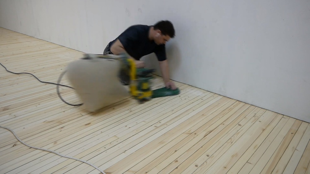 Перед началом работы обязательно первым делом нужно убраться: сначала подмести крупный мусор при помощи швабры, далее пропылесосить. Поскольку у нас стоит задача снять текущее покрытие без сильного выравнивания, то сначала нам придется снять краску, а это лучше сделать, проходя пол перпендикулярно волокнам, чтобы залезть во все ямки, во все неровности. Только таким образом мы сможем хорошо и качественно снять краску.