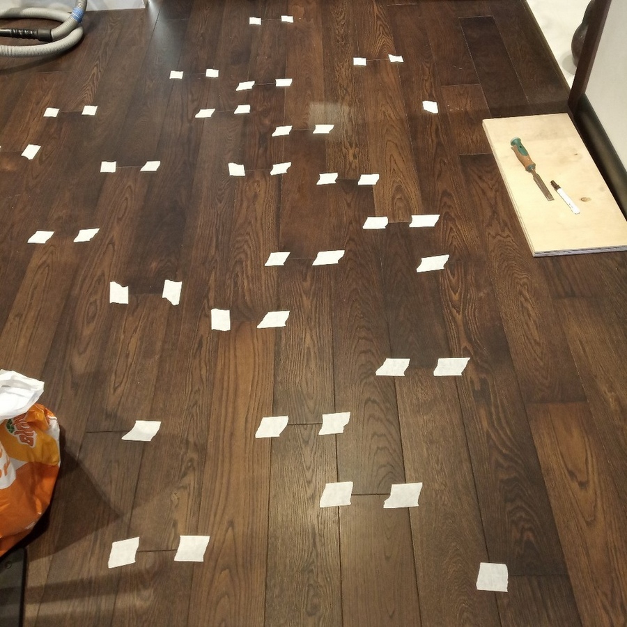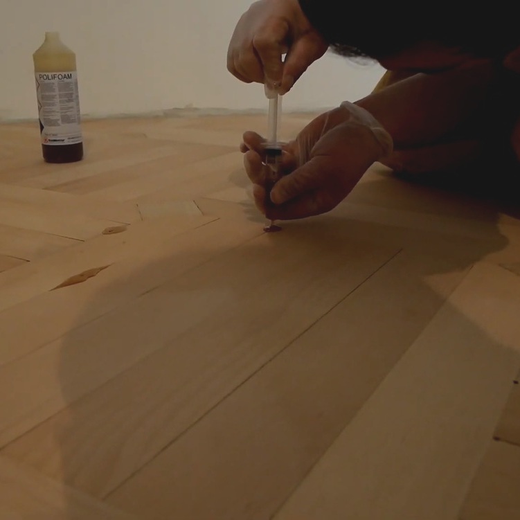 Если речь идет о дефектах на имеющемся покрытии (лаковом, масло-восковом или каком-либо еще), то мы оцениваем, насколько серьезны эти дефекты, сможем ли мы их убрать с помощью шлифовки или замены элементов. Большинство таких дефектов исправляется шлифовкой, но иногда требуются инъекции для паркета, поскольку есть локальное или сплошное отслоение паркета от основания. Такие ситуации решаются с помощью инъектирования ремонтным клеем.