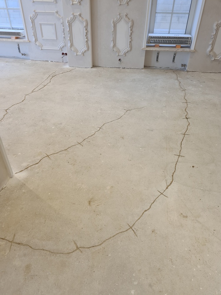 Как это происходило: сначала все трещины расшили специальным инструментом – виброрезом, затем сделали расшивку для специальных рифленых железок, которые вставляются поперек шва, пропылесосили швы и заполнили средством для ремонта стяжек UZIN KR 516 на эпоксидной основе. После смешивания компонентов смола заливается в трещины, быстро схватывается там и становится крепкой. Далее эти места необходимо просыпать кварцевым песком.