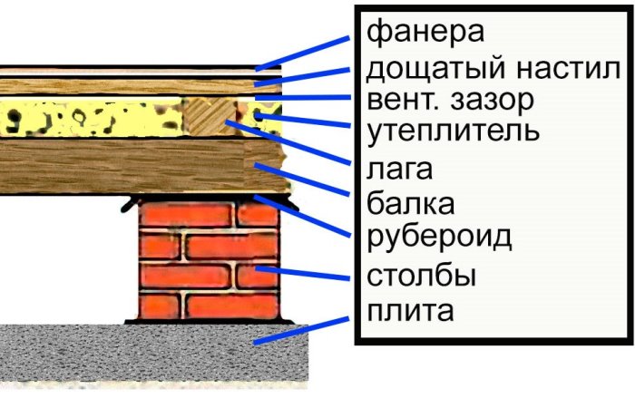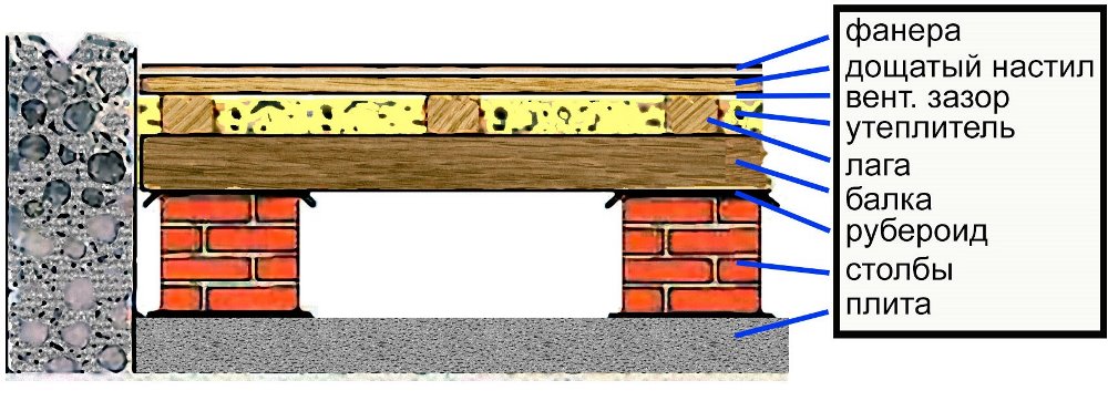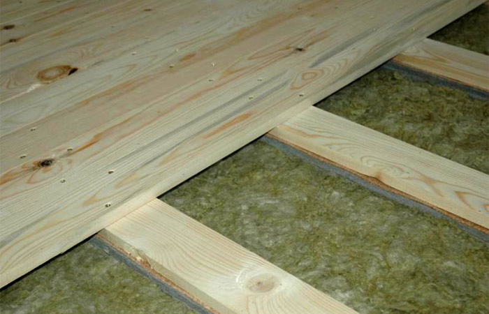 Мастера-паркетчики сначала выставляют лаги (сухая строганая доска или брус толщиной около 45 мм) по уровню с промежутками по центрам – 500 мм, в промежутки между лагами укладывается или минеральная вата, или керамзит, затем производится настил слоя доски (доска сухая строганая толщиной от 25 до 45 мм). Доска предварительно покрывается антисептиком. Заключительный этап – один или два слоя фанеры в зависимости от выбранного варианта укладки доски. Фанера крепится с помощью саморезов и клея.