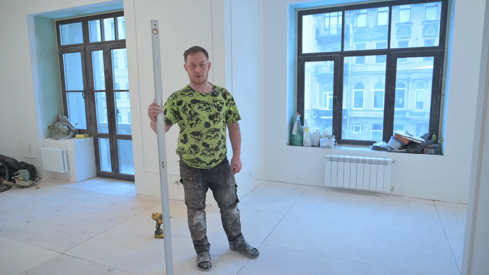 Третья наша боль – это ровность основания, на которое мы будем стелить наш паркет. Поскольку мы финишные отделочники основания, то в результате все шишки полетят на нас, поэтому для нас очень важно ровное основание. Обычно мы не проверяем уровнем, у нас двухметровое правило. По ГОСТам и нормативам на такое правило возможны перепады 2 мм. Но в нашем случае пришлось использовать уровень, потому что в некоторых местах есть уклон к стенам, и он достаточно большой.