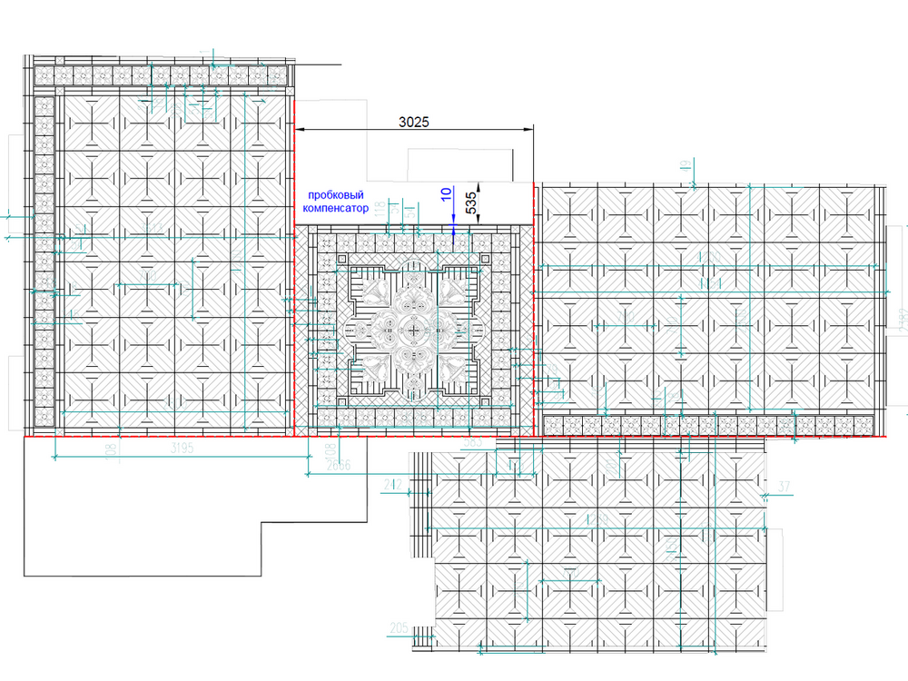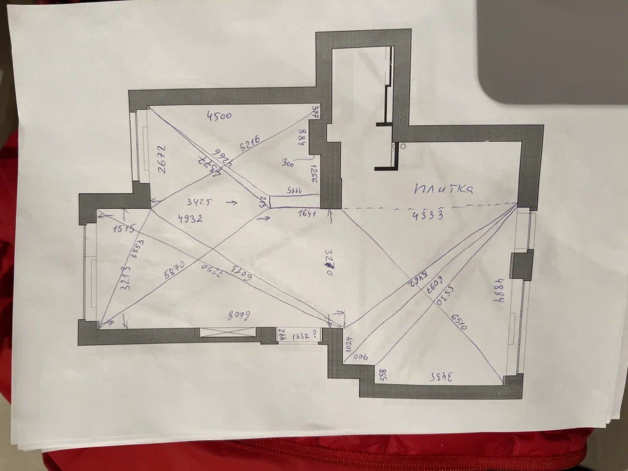Первоначально мы выполнили тщательные замеры помещения – сделали обмерочный план, периметр помещения с размерами, отметили все места стыковки паркета с камнем, диагонали –для художественного паркета это очень важно. Контрольный обмер сделали после подготовки стен к чистовой отделке.