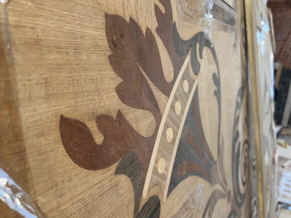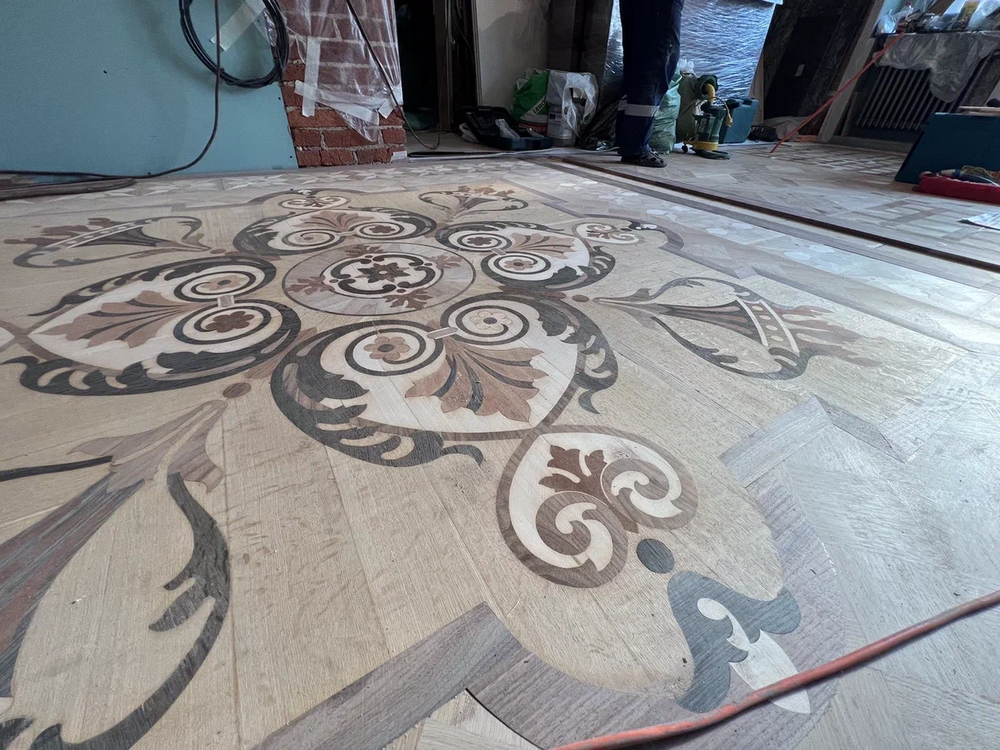 Самые сложные и при этом интересные работы, конечно же, были связаны с реставрацией исторического паркета – розетки и модулей по ее периметру. Было решено максимально сохранить исторические элементы и сделать новые модули для полного покрытия пола по тому же историческому рисунку.