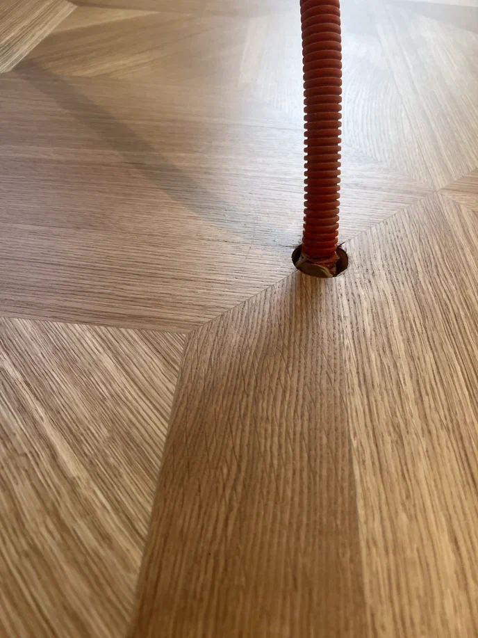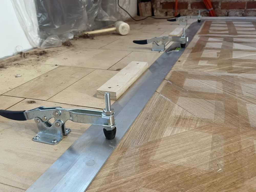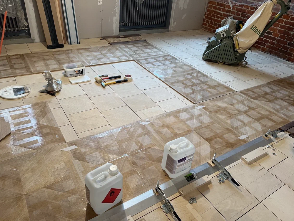 Далее на объекте наши мастера выполнили шлифовку стяжки, чтобы обеспечить ровную и гладкую поверхность для последующей укладки паркета. Дополнительно уложили фанерное основание, подняли высоту пола до уровня гранитной плитки, с которой в дальнейшем стыковали готовый паркет.