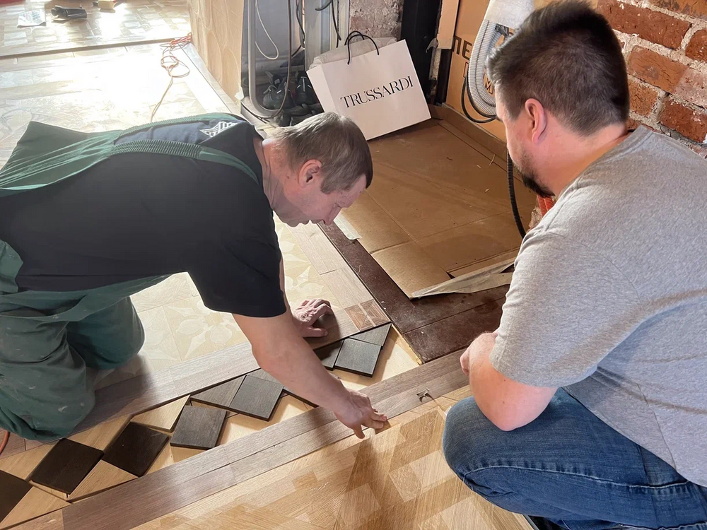 При демонтаже паркета часть старых модулей была сломана, но мастера бережно и аккуратно восстановили все, что можно было восстановить. Также с клиентов договорились, что сначала сделаем пробные образцы старых и новых модулей, чтобы оценить разницу между историческими деталями и новоделом, а также определиться с финишным покрытие розетки.