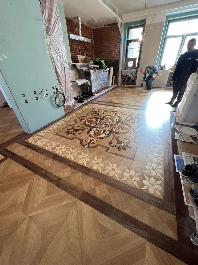Одним из сложных моментов в рамках укладки художественного паркета была разметка. У нас были четкие привязки к осевым линиями помещения, от которых шла вся раскладка. Буквально каждая деталь, каждый элемент, даже самый маленький, даже вдоль стены согласовывался по направлению волокон, цвета, порода древесины. Здесь не было никаких импровизационных моментов, все именно так, как изначально нарисовали. Это было сопряжено с основной сложностью именно в замерах, потому что стены в квартире кирпичные, четких углов нет. Мы с задачей справились с минимальными погрешностями – в пределах миллиметра.