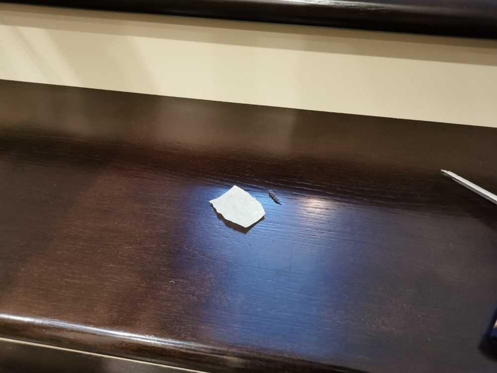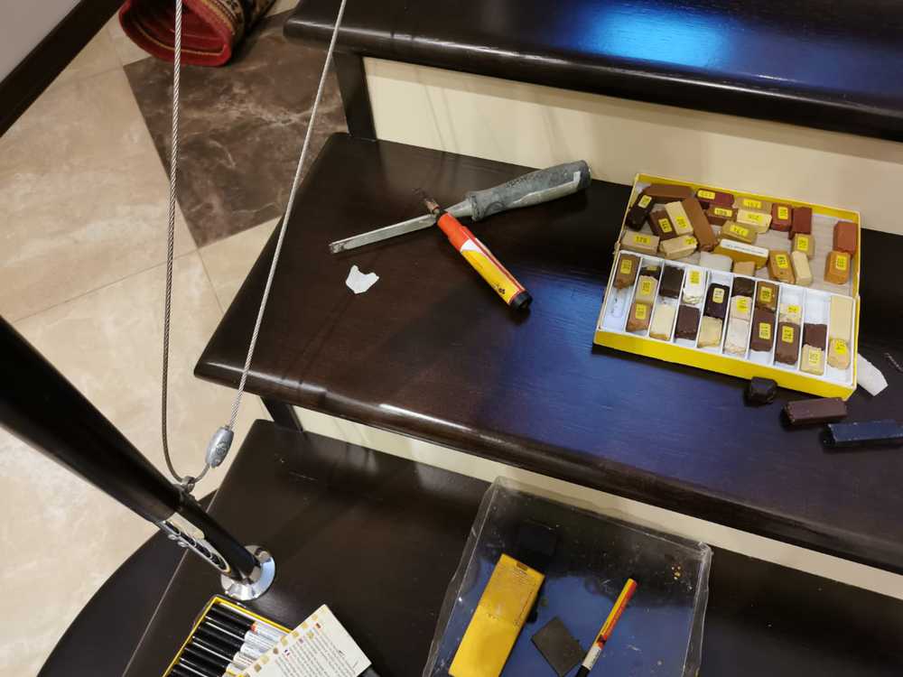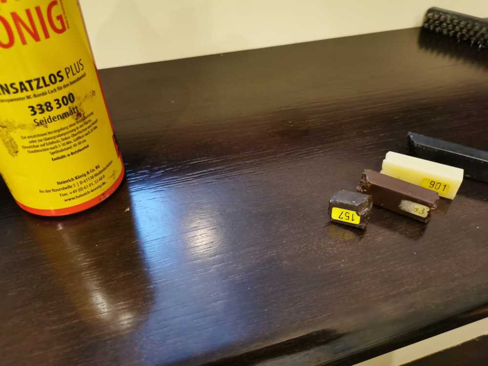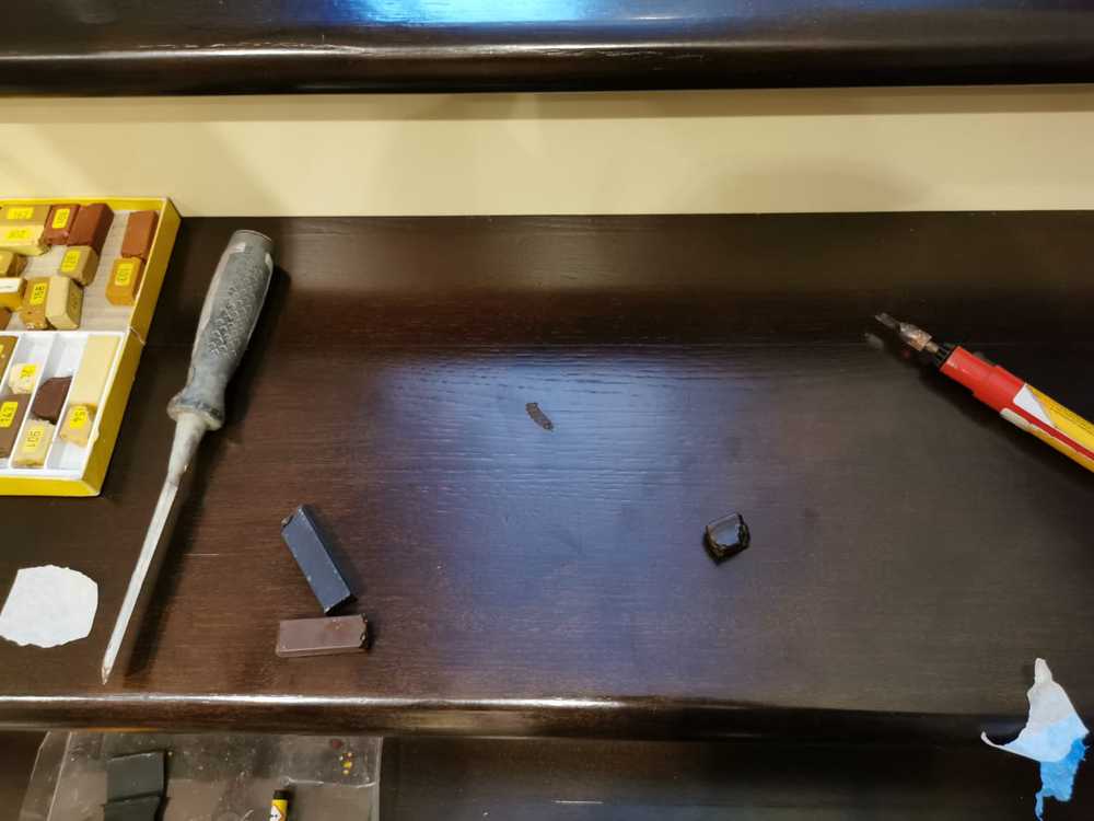 - Процесс: сначала трещина в древесины расшивается, затем аккуратно заполняется твердым воском такого оттенка, который будет максимально приближен к исходному цвету поверхности. Далее устанавливается поверхность по блеску: эффект виден на последней фотографии.