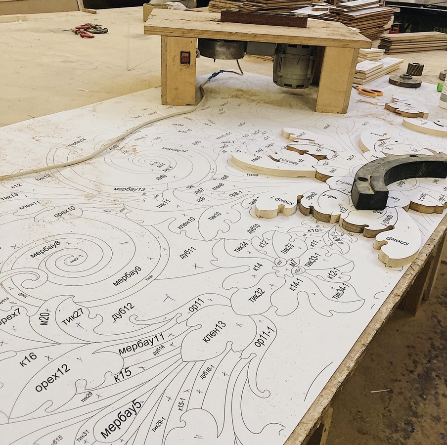 На другом объекте была интересная история, где тоже один из наших партнеров и тоже мастер по паркету попросил нас изготовить художественный фриз. При этом из заданий, полученных у клиента, у него была всего лишь одна фотография, где этот фриз даже тяжело было разглядеть (6:16), были только видны какие-то детали, при этом не в прямой проекции, а под углом, еще и какой-то такой небольшой фрагмент, не совсем понятно, какие породы дерева и т.д.