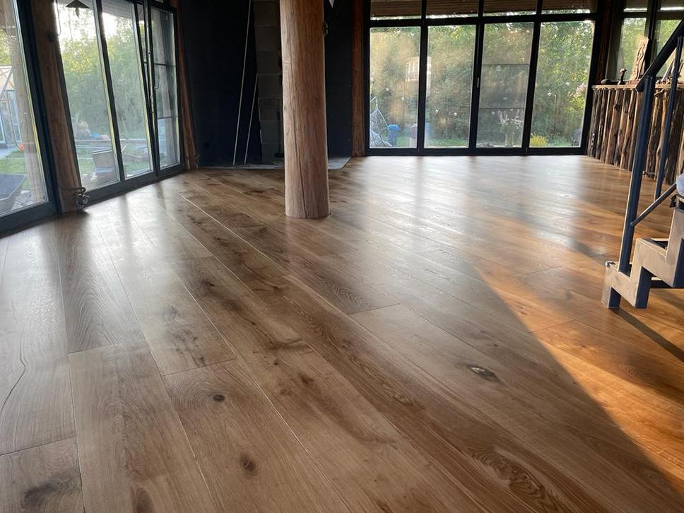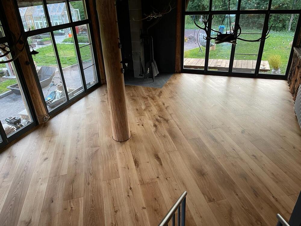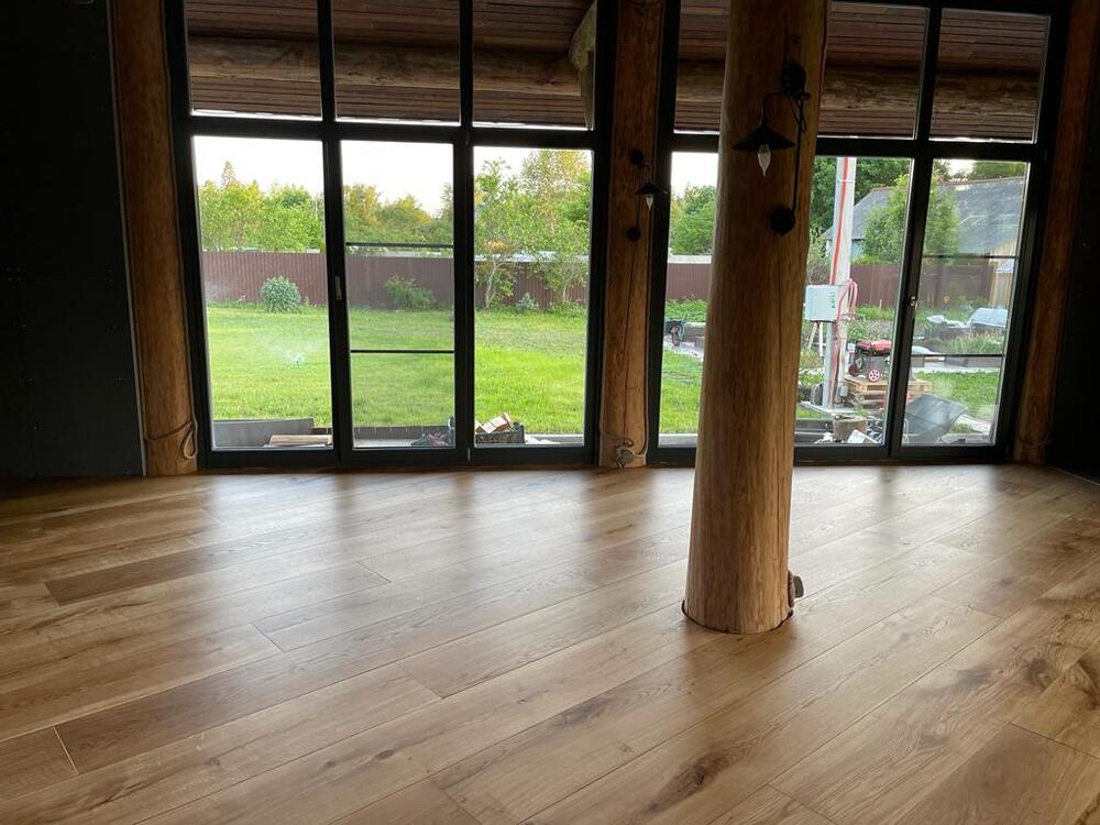 Далее уложили крупноформатную паркетную доску, оставив специальные технологические швы шириной по 1,5-2 мм, которые заполнили шпатлевкой FlexFill. В качестве финишного покрытия использовали масло Berger Hardoil.