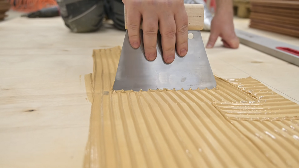 Шпатель создает нам гребенку. Держать шпатель нужно практически вертикально с небольшим наклоном, чтобы гребенка имела нужную высоту. Между гребенками клей должен оставаться тонкой пленкой. Частая ошибка – когда шпатель держат очень низко, и очень много клея остается между гребенками. Нужно следить за тем, чтобы гребенка постоянно была, и нигде не было пропусков. Работать шпателем желательно одной стороной, чтобы вторая сторона всегда была чистая – так ваши руки тоже останутся чистыми.