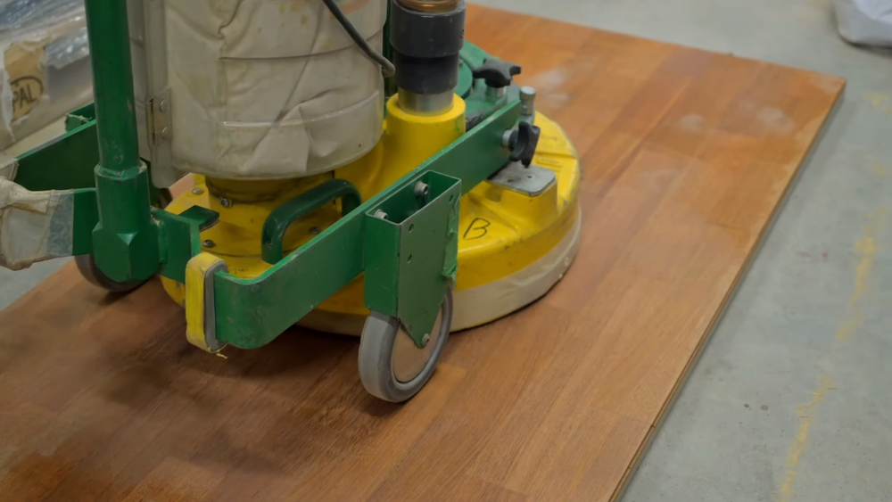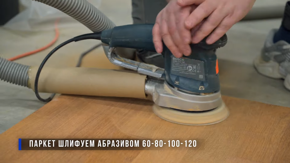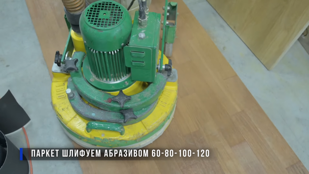 На первичной шлифовке ленточной машиной часто на экзотике попадаются очень крепкие лаки, нам приходится опускаться на более крупные зерна, это немного растягивает процесс, потому что не всегда имеет смысл начинать сразу с крупного зерна, надо стараться начинать использовать зерно как можно мельче. Свежий паркет всегда шлифуется легче, чем уже полежавший паркет.