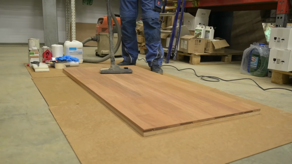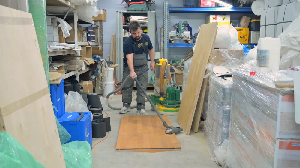 На этих щитах мы планируем продемонстрировать варианты тонировки паркета из мербау, так что нам нужно подготовить их к нанесению масла. Поэтому следующий этап – это обеспыливание поверхности большим промышленным пылесосом. Настоятельно рекомендуем мастерам использовать отдельную специальную щетку для чистовой уборки и не применять для этого щеточки, которые можно использовать, например, для обеспыливания перед грунтованием еще до укладки, потому что сюда может попадать и камень, и крупный песок, который расцарапает саму щетку, или камушек забьется в структуру волосков, резинки или самого пластика, и потом на чистовой поверхности просто будет оставлять следы. Поэтому рекомендуем иметь отдельную щетку для обеспыливания.