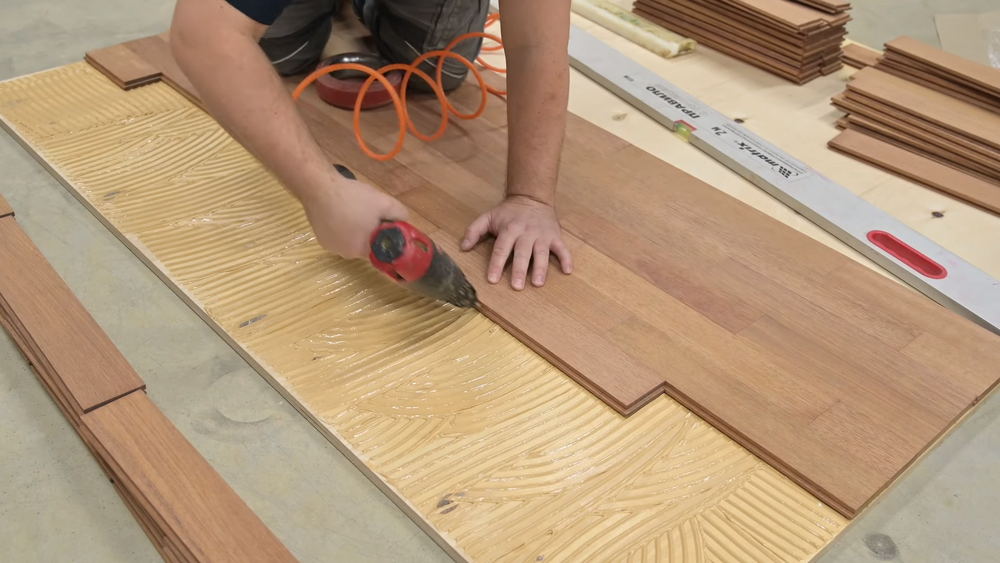 Поскольку мы делаем демонстрационный щит, то выбрали обычную классическую палубную укладку без изысков. Будем приклеивать к фанере, будем использовать шпилечник – специальный пневматический пистолет и ручной инструмент. Конечно, на реальном объекте это делается немного иначе: там обязательно делается разметка, привязка по помещениям, либо, если есть дизайн-проект, то разметка идет по этому проекту, рисунок может быть разнообразный. Здесь у нас задача достаточно простая.
