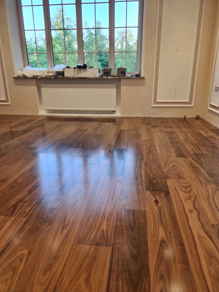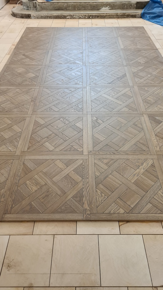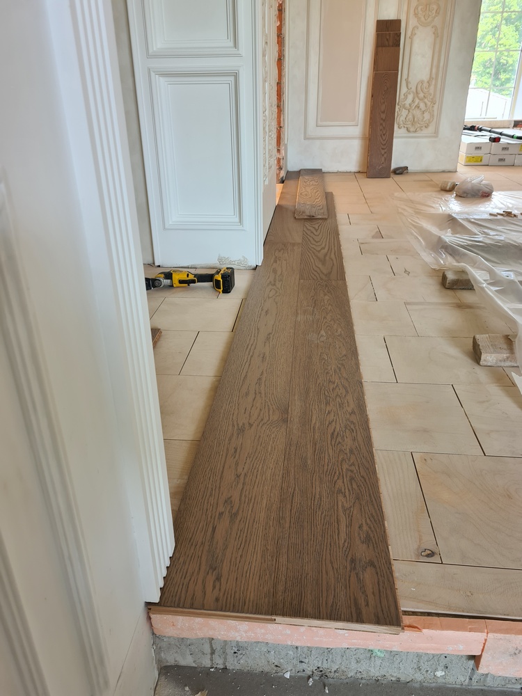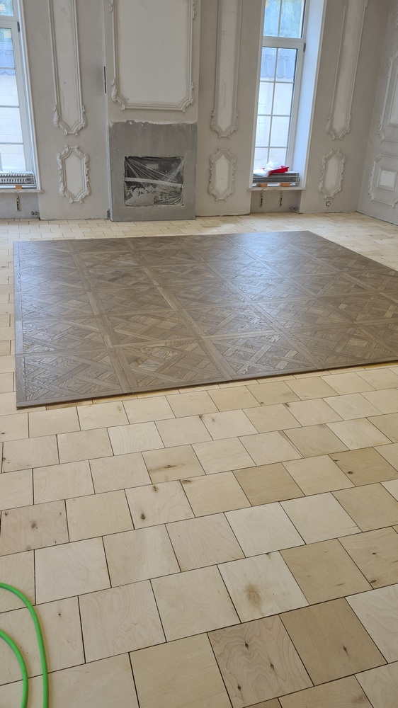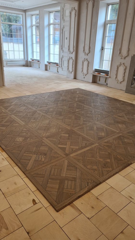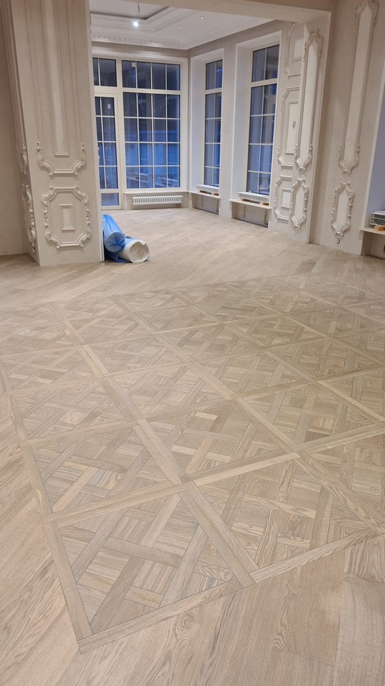 После окончания работ на 2 этаже мы перешли к укладке паркета на 1 этаже дома в большом зале.