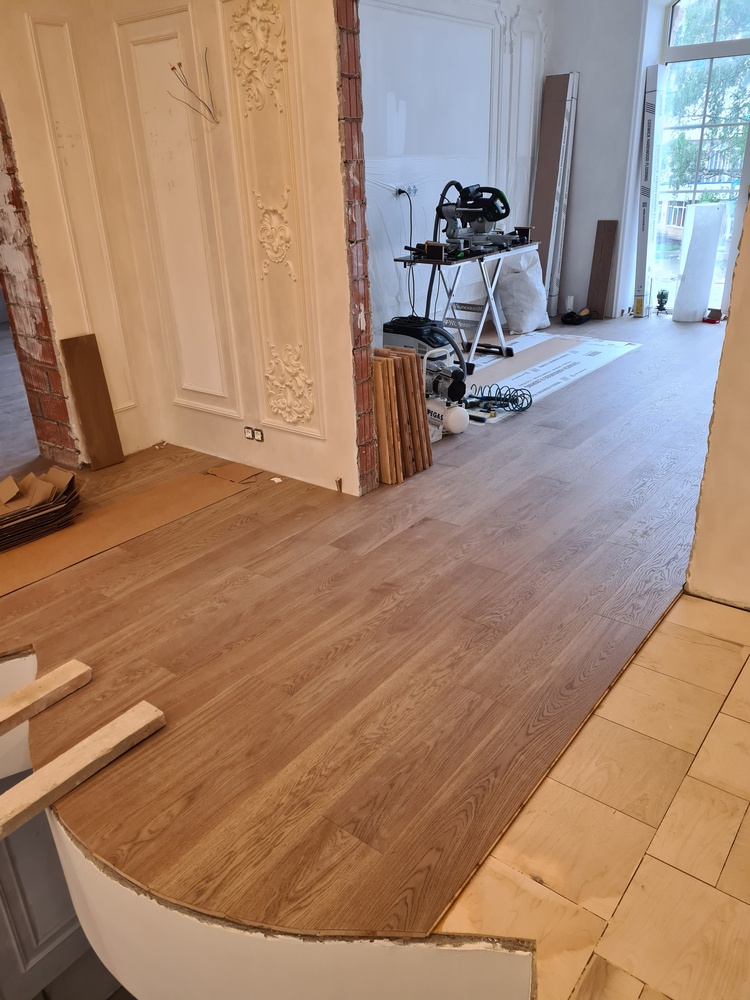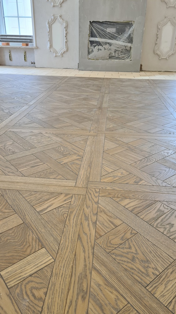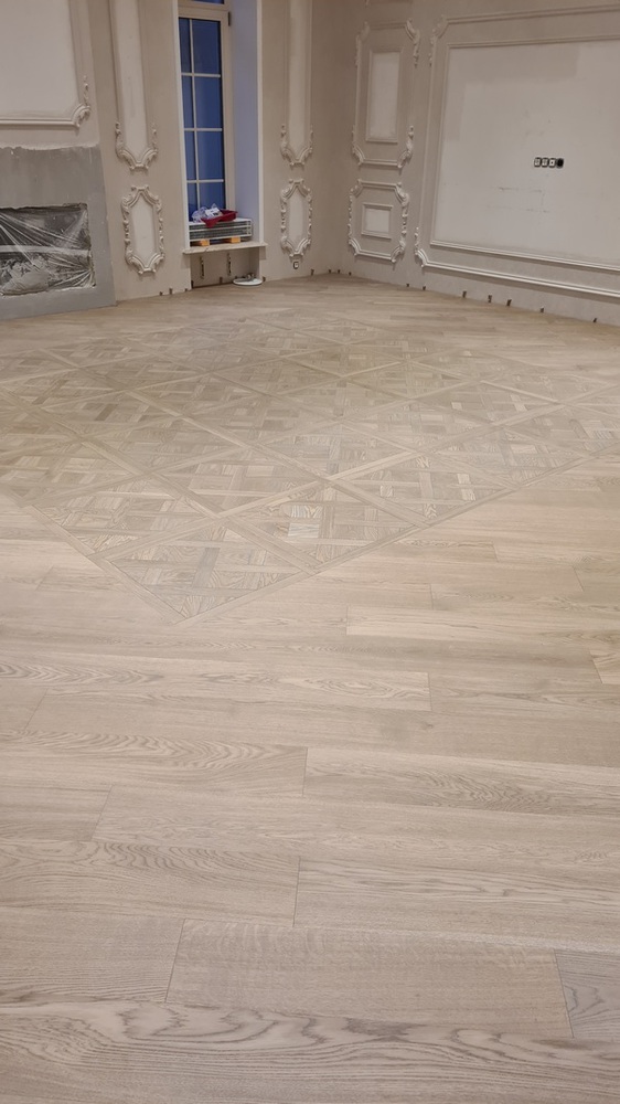 Перед укладкой паркета в каждом помещении мы первоначально делаем разметку, чтобы видеть, как будут лежать доски относительно периметра и примыканий к различным объектам. Это очень помогает представить итоговый результат и вовремя внести коррективы.