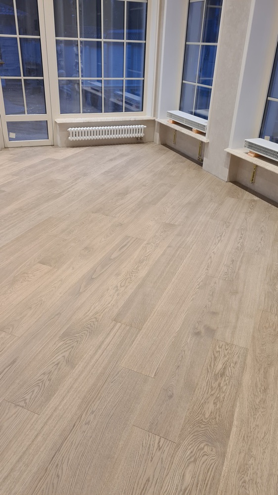 Во всех помещениях в этом доме мы укладывали доску Coswick 19 мм с приклеиванием к основанию – использовали однокомпонентный прочно-эластичный полиуретановый клей Berger Bond M1 P, качество которого проверено уже на многих наших объектах. Примыкание паркета к напольным покрытиям из других материалов (в частности, с плиткой) мы выполняли с зазором 6-8 мм и последующим заполнением герметиком подходящего оттенка. Также оставляли зазоры на расширение паркета по периметру помещений.