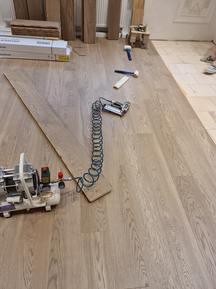 Например, в гостиной дизайнер предлагала один вариант раскладки, но после разметки мы поняли, что гораздо лучше подойдет другая раскладка, а именно со стороны холла. В этом помещении мы укладывали доску Coswick толщиной 19 мм в такой последовательности: наносили клей на фанеру, подрезали доску по нужной раскладке и пристреливали ее шпильками Senco к фанере.