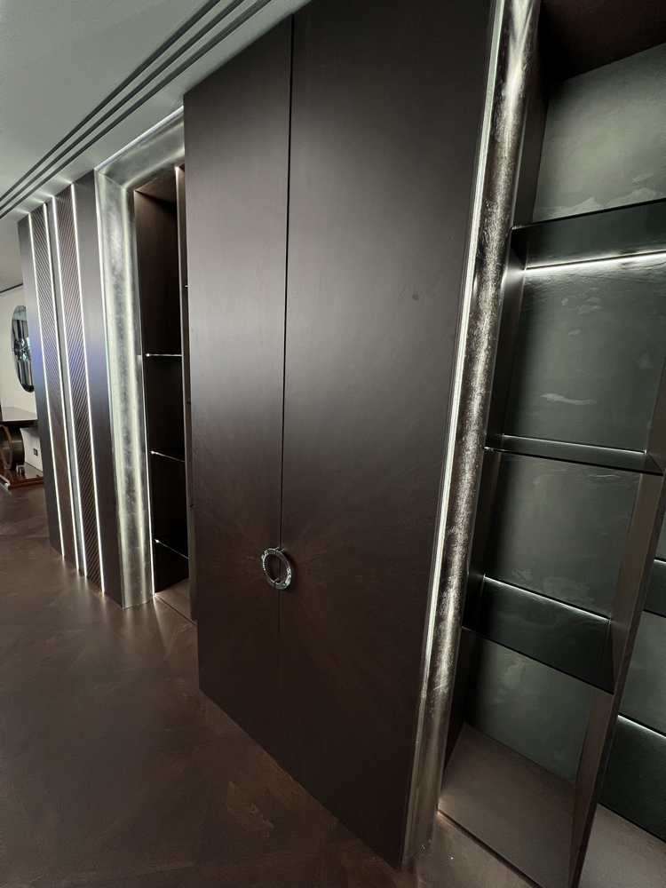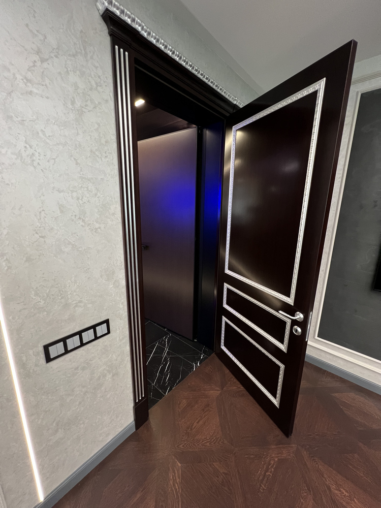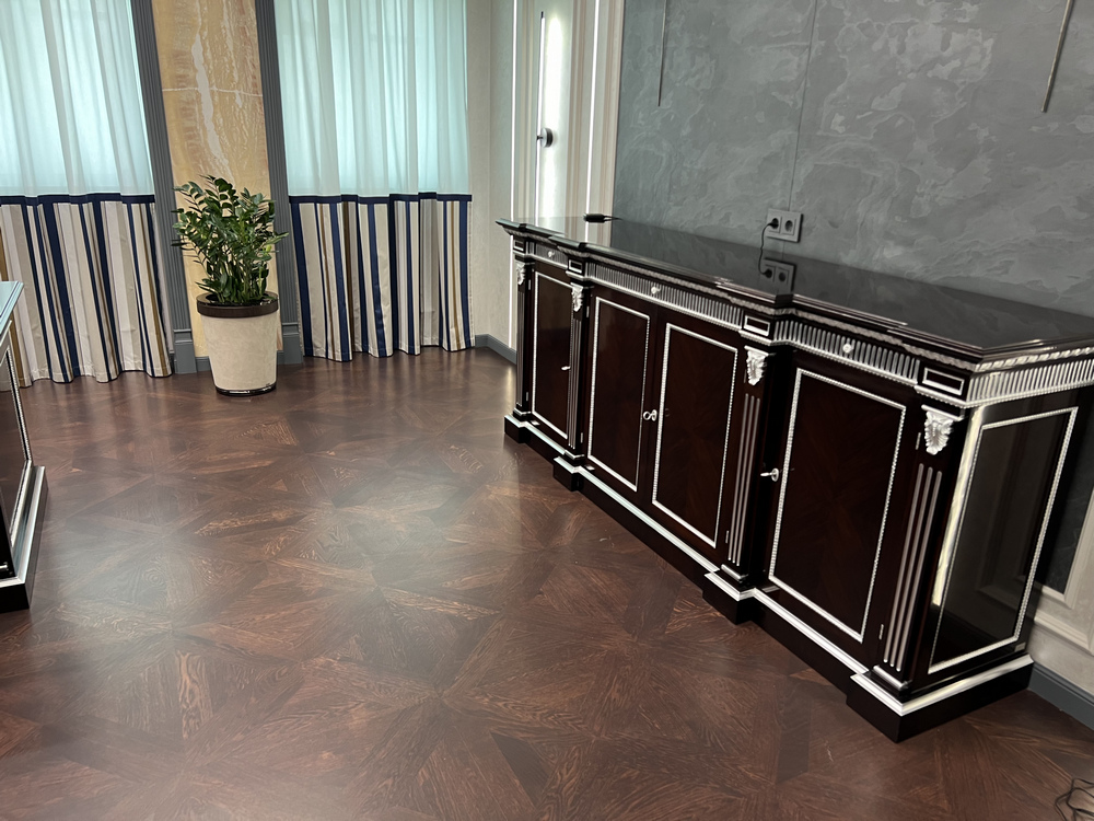 Данный проект длился порядка полутора лет. Начиналось все с паркета: к нам обратился дизайнер с проектом, где мы сначала согласовывали рисунок геометрического пола, который впоследствии был изготовлен из массивного штучного паркета толщиной 15 мм. В мастерской мы сделали пробные модули-щиты, несколько раз ездили на объект, делали пробные выкрасы и согласовывали с дизайнером и клиентом. Чуть позже, уже в момент укладки паркета, мы сделали огромный выкрас на объекте. Пожалуй, это был рекордный выкрас в истории компании «Вернисаж» – площадью примерно 10 квадратных метров. А еше перед укладкой паркета мы выезжали на объект для оценки качества основания. По основанию у нас были некоторые вопросы, и мы давали рекомендации строителям по исправлению недочетов. В конечном итоге все сделали хорошо, и наши мастера уложили паркет.