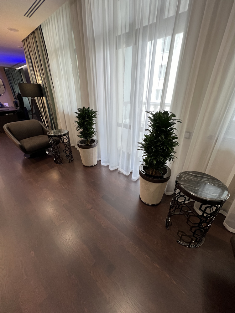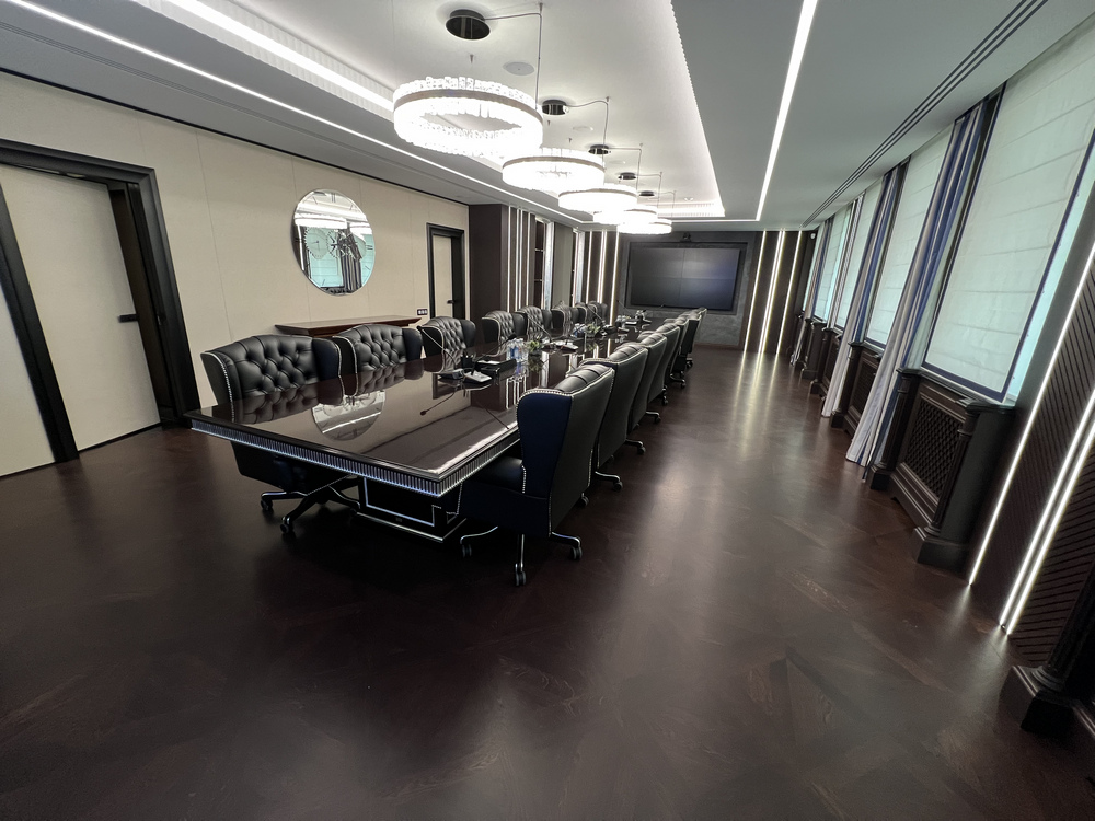 Еще одним интересным моментом стоит отметить то, что на этапе согласования абсолютно было исключено применение инженерных конструкций паркета, потому что сразу было заявлено решение клиента, что мы делаем объект серьезного уровня, и никаких переклеенных конструкций, то есть никаких дешевых вариантов здесь быть не может, и мы применяем исключительно массивные полы.