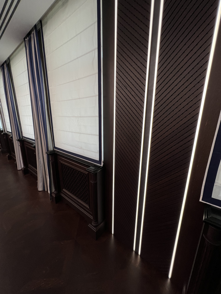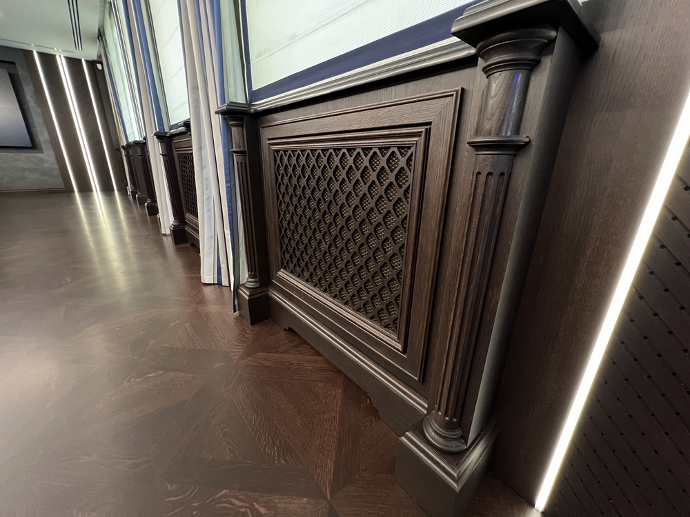 После выполнения паркетных работ в первом помещении образовалось второе помещение примерно такой же площади, то есть суммарно мы укладывали массивный паркет примерно на 200 квадратных метрах. И в процессе выполнения работ, когда заказчики увидели наши добросовестные отношения, родилась идея отдать нам в работу стеновые панели, деревянные решетки радиаторов, элементы мебели в этом помещении и потолок, в том числе потолок с подсветкой.