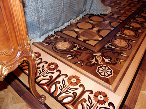 Пол, выложенный художественным паркетом, может перестать играть вспомогательную, фоновую роль и стать равноправной, а по желанию и доминантной частью интерьера. Цветовое взаимодействие со стеновыми панелями, дверьми и мебелью по совпадению или контрасту, дублирование на полу очертаний и мотивов лепных потолочных украшений и живописных плафонов или резных украшений дверей и буазери, повторение бордюром контуров фонтана, подиума, камина в рисунке пола, сочетание рисунков художественного паркета с резьбой мебели и лепниной в интерьере – вот лишь немногие примеры равноправного участия пола в общем эстетическом решении интерьера. Нередко художественный паркет используют, чтобы обозначить функциональный или эстетический центр помещения и расставить акценты.